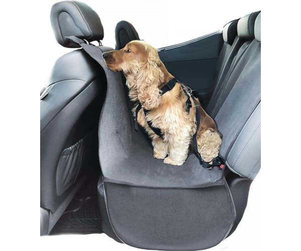 schützt die Rückbank vor Schmutz, Tierhaaren und Beschädigungen · überspannt den gesamt Rückbankbereich und auch den Fußraum · verhindert auch, dass der Hund nach vorn springt · mit Sicherheitsgurtöffnung · schmutz- und wasserabweisendes Gewebe, waschbar · schnelle Montage mit Schlaufen an den Kopfstützen der Vorder- und Rücksitze · anthrazit · SB Verpackung