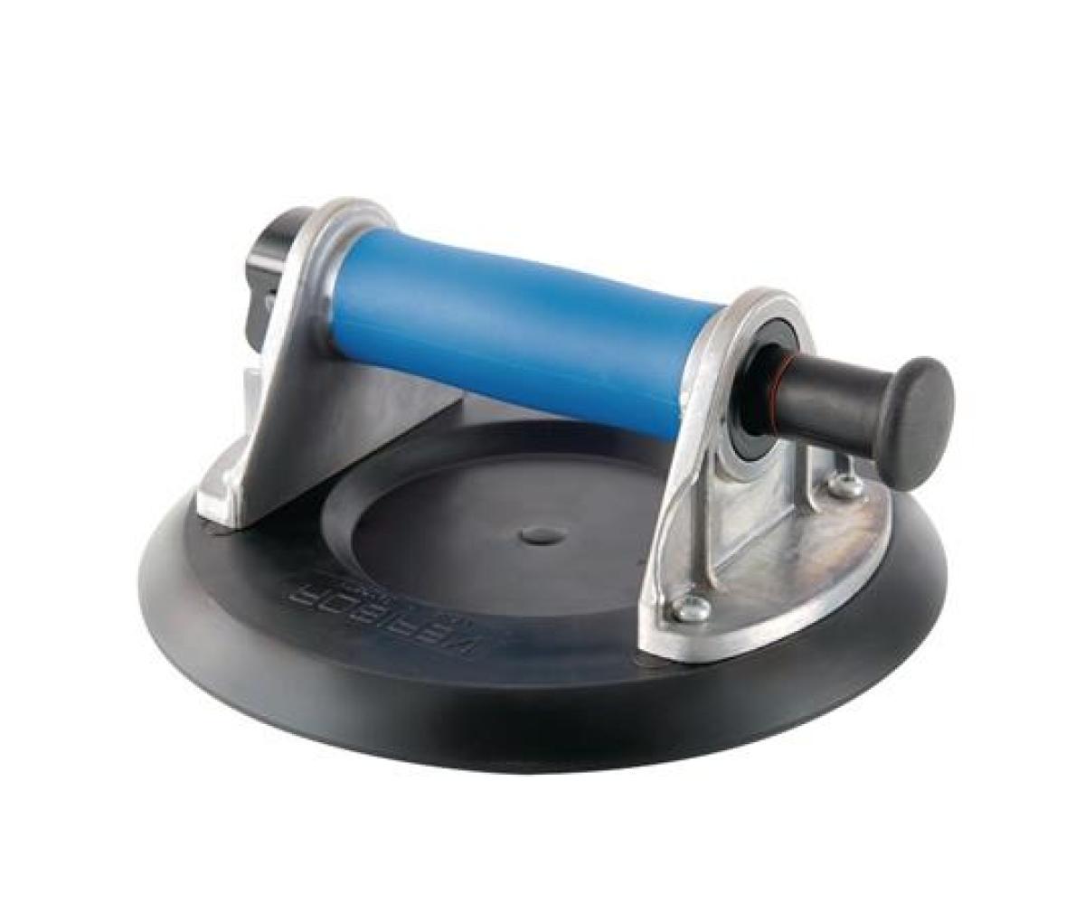 Pumpensaugheber aus Aluminium · mit eingebauter Handpumpe · Vakuumaufbau durch betätigen des Pumpenstößels · Belüftungshebel gegen unbeabsichtigtes Betätigen gesichert · Sicherungsring für optische Kontrolle der vollen Tragleistung · profilierte Gummischeibe mit 4 Dichtlippen · im Kunststoffkoffer · Gummischeiben auswechselbar · Griff-Ø 3 - 3,5 cm