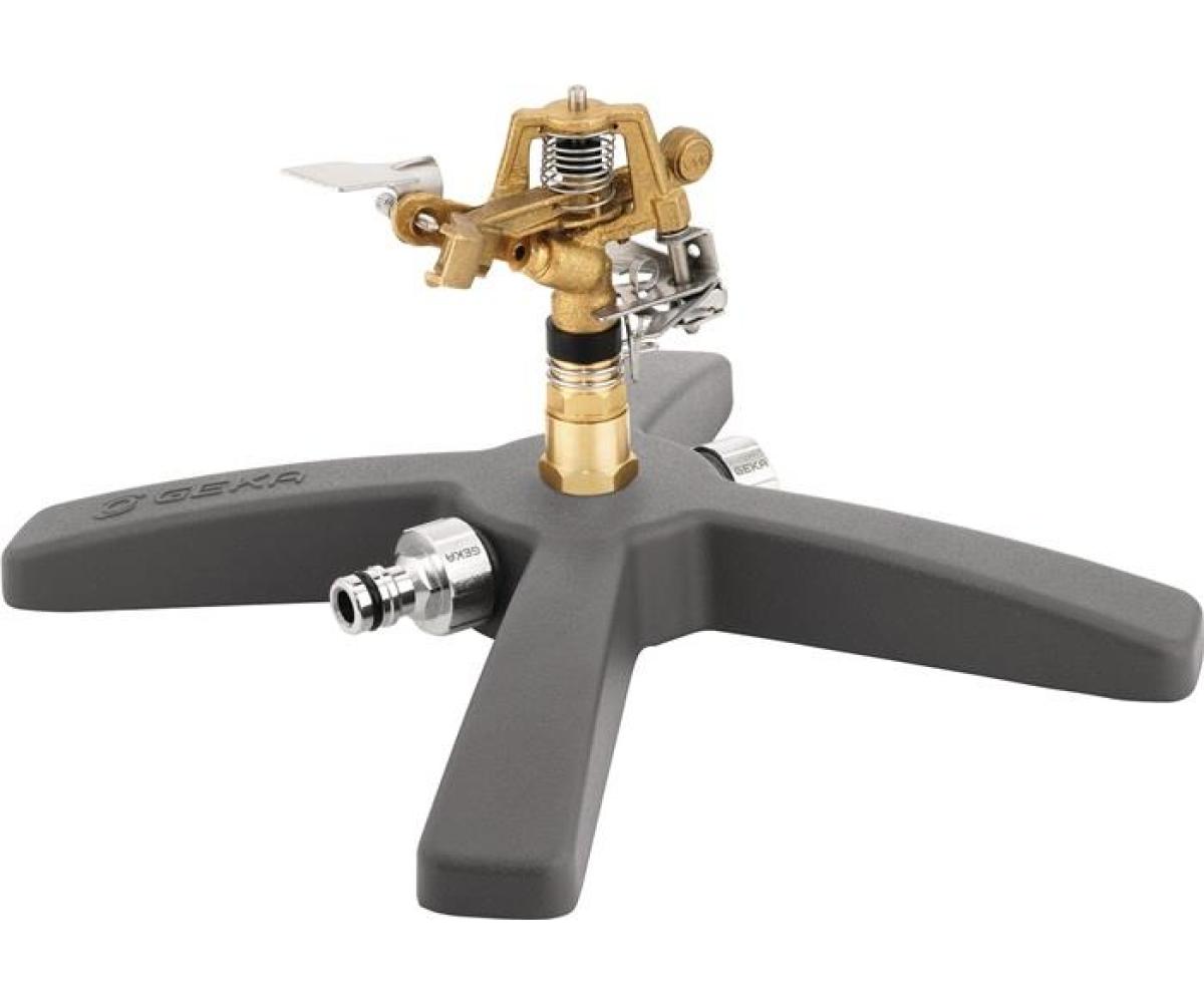 robuster aus Metall gefertigter Schwinghebelregner in Profiqualität · ermöglicht die Bewässerung von Kreisflächen bis maximal 26 m Durchmesser oder individuell einstellbaren Kreissegmenten · mit verchromten Messingstecker · kompatibel mit allen marktüblichen Stecksystemen · robuster Standfuß aus pulverbeschichtetem Aluminium · mit Klauenkupplungen beidseitig möglich