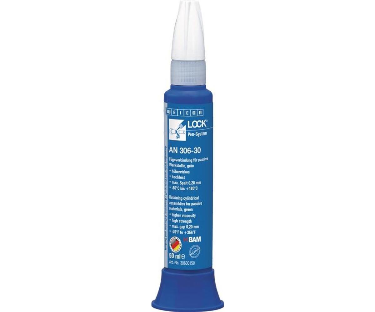 Weitere technische Eigenschaften · Spaltfüllvermögen: max. 0,2mm · Handfest: 2-5min · Temperaturbeständigkeit: -60 bis + 180°C · Gewinde: max. M36 · Zulassung: BAM · Fügeverbindung WEICONLOCK · AN 306-30 hf.hv.grün 50 · ml Pen ·