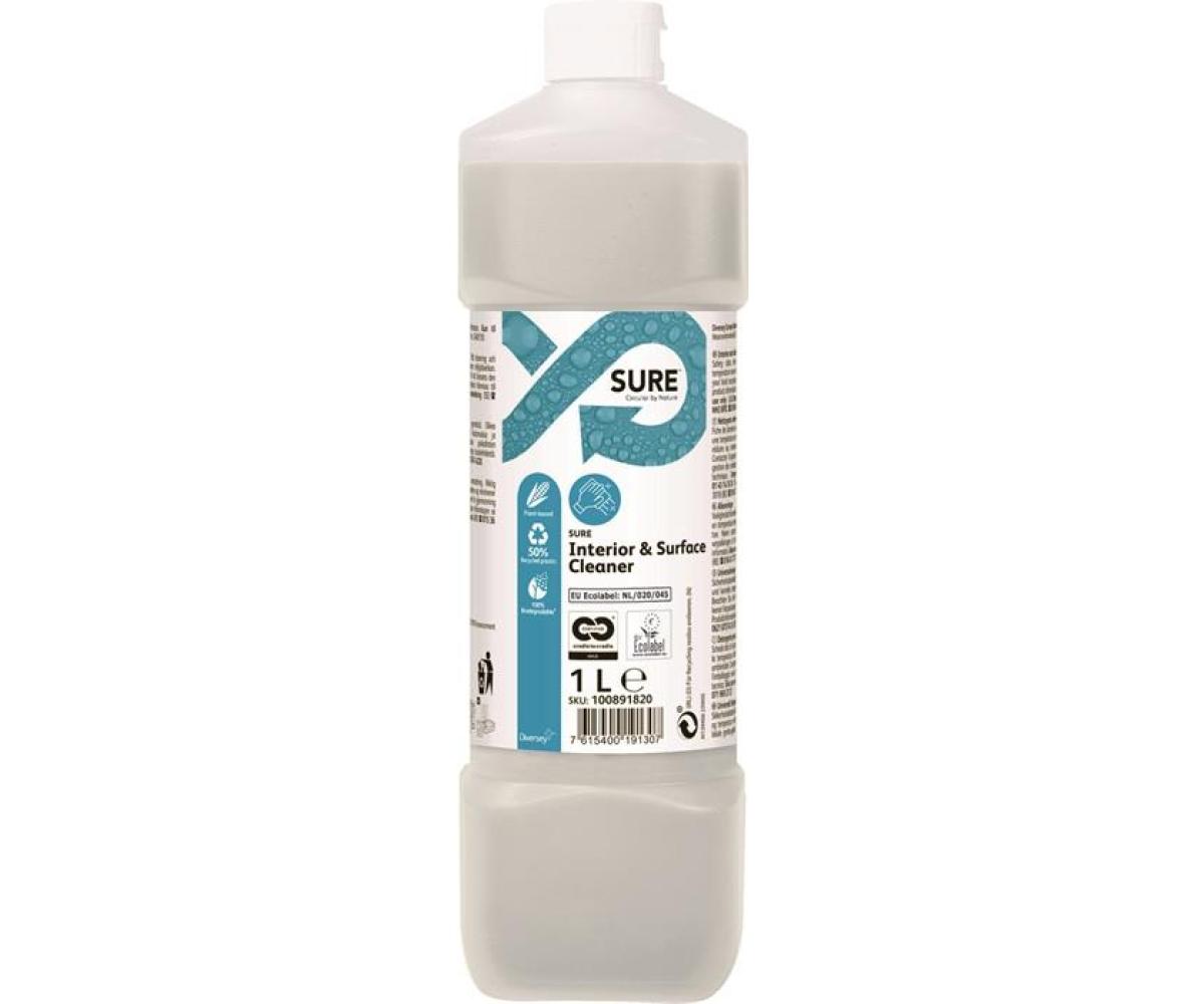 Konzentrat · für die Reinigung von Oberflächen, Böden, Wänden, Türen, Decken, allgemeine Innenreinigung (auch Küchenbereich) · geeignet für alle wasserfesten Oberflächen, einschliesslich Aluminium und andere weiche Metalle · schnellwirkend, trocknet schnell und streifenfrei · duft- und farbstofffrei · zertifiziert nach EU-Ecolabel Mischverhältnis: Sprühflasche: 1% bis 1,3% (750 ml Wasser, 7,5 ml - 10 ml Reiniger) / Eimer: 0,3% bis 1,5% (1 Liter Wasser, 3 ml - 15 ml Reiniger) SURE-Reinigungsmittel sind auf pflanzlicher Basis, zu 100% biologisch abbaubar sowie sicher in der Anwendung - keine umweltgefährdende Einstufung, keine Kennzeichnung, keine Gefährdung für Anwender