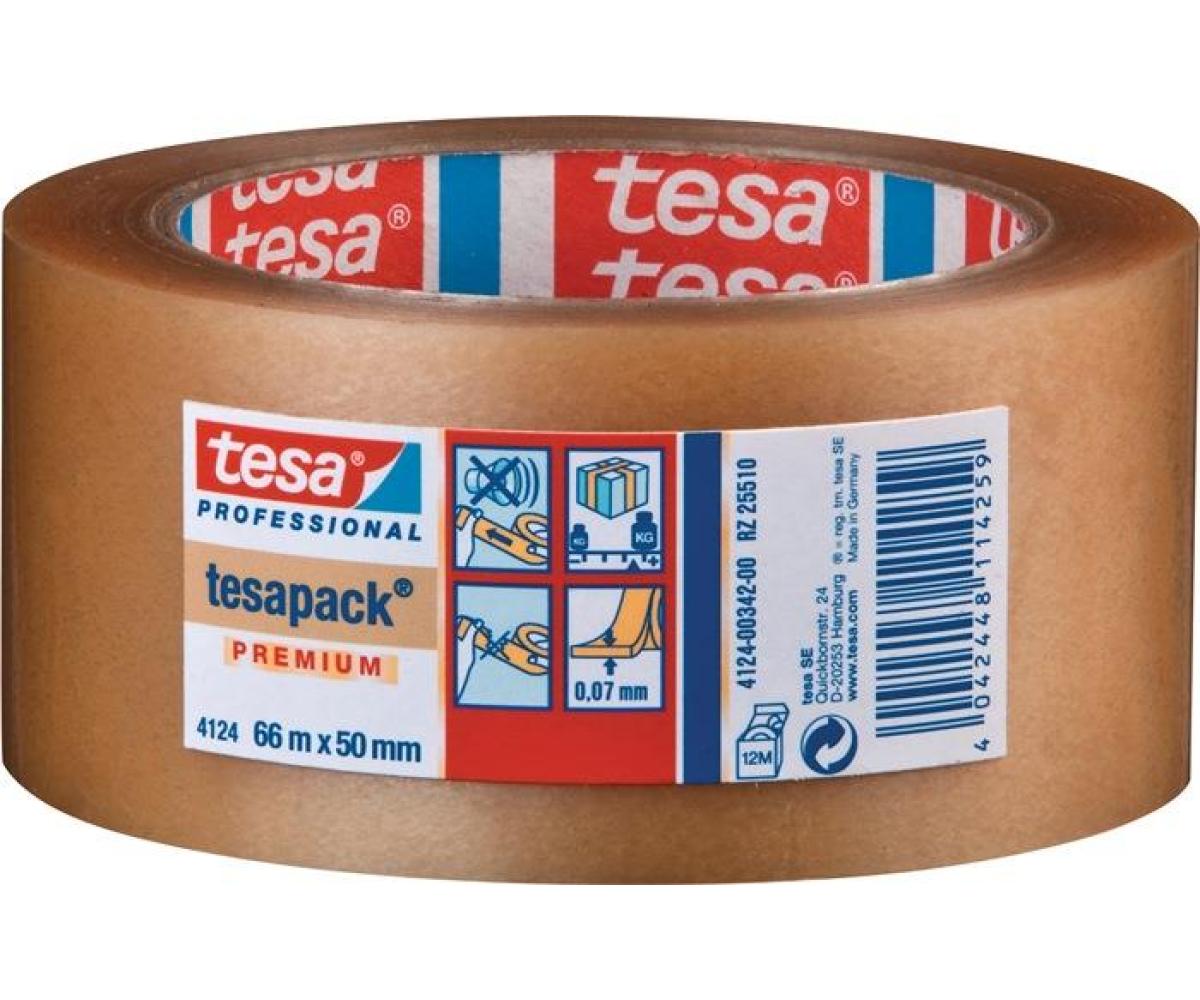 Weitere technische Eigenschaften · Klebmasse: Kautschuk · Trägerart: PVC-Film · Gesamtdicke: 0,065mm · Reißkraft: 60N/cm · Klebkraft: 3,2N/cm · Verpackungsklebeband PVC · tesapack® 4124 farblos · L.66m B.50mm Rl.TESA ·