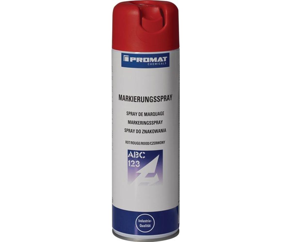 hochwertiger Lack auf Acrylharz-Basis · mit intensiven, dauerhaften Farb- und Leuchtpigmenten · frostsichere Langzeitmarkierung (3 - 6 Monate) · hohe Leucht- und Deckkraft · geringe Verschmutzungsgefahr · Sprühkopf mit 360°-Spezialventil zur Kennzeichnung in allen Lagen, auch Überkopf · trocken nach ca. 1 - 5 Min. (abhängig von der Umgebungstemperatur) · frei von Schwermetallen und Silikonen Markierungsspray rot 500 · ml Spraydose PROMAT · CHEMICALS ·