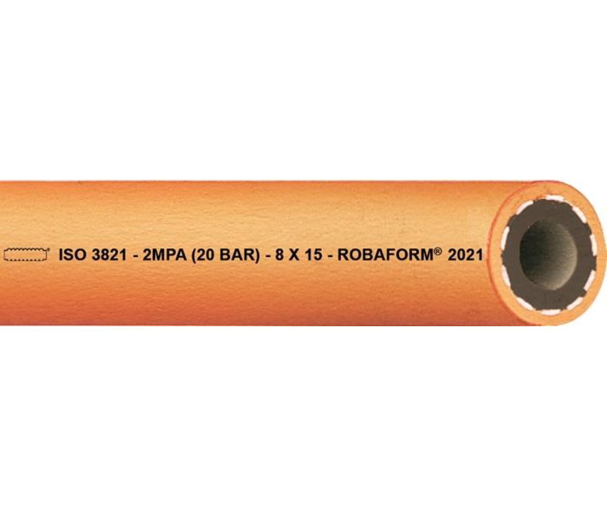 Weitere technische Eigenschaften · Außendecke: EPDM · Gewicht: 0,200kg · Aufdruck: ISO 3821 - 2MPa (20 bar) - Abmessung - Robaform® - Jahr · Farbe Innenseele: Schwarz · Fertigungsart Innenseele: Glatt · Fertigungsweise Aussendecke: Glatt · Platzdruck: 60bar · Propangasschlauch · ROBAFORM® ID 8,0mm · Wandst.3,5mm AD 15,0mm · Aufdruck: ISO 3821 - 2MPa (20 bar) - Abmessung - Robaform® - Jahr · Farbe Innenseele: Schwarz · Fertigungsart Innenseele: Glatt · Fertigungsweise Aussendecke: Glatt · Platzdruck: 60bar ·