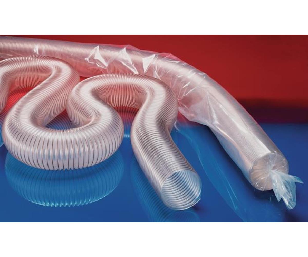 Anwendungen: Absauganlage, Entstaubungsanlage, Filteranlage, Ölnebelabsaugung, flexibler Schlauch für Gase und für abrasive Stäube, Pulver, Fasern, Lebensmittelindustrie, Pharmaindustrie: Lebensmittel, Pharmazeutika, Mischer, Trockner, Verpackungsmaschine, Big-Baittel, Pharmazeutika, Mischer, Trockner, Verpackungsmaschine, Big-Bag Befüllung und Entleerung, Mühle, Förderung von z.B. Reis, trockene Lebensmittel, Getreideprodukte, Zucker, Milchpulver, Pulver, Kaffee, Tee, Getreide, Mehl, gefrorene Lebensmittelrderung von z.B. Reis, trockene Lebensmittel, Getreideprodukte, Zucker, Milchpulver, Pulver, Kaffee, Tee, Getreide, Mehl, gefrorene Lebensmittel, Getreide, Mehl, gefrorene Lebensmittel Eigenschaften: Zulassung nach EU-Verordnung 10/2011 (Lebensmittelsimulanzien A, B, C oder E und D2), sowie EG 1935/2004 · abriebfest · geruchs- und geschmacksfrei, gute Öl-, Benzin- und Chemikalienbeständigkeit, hochflexibelund · stauchbar 3:1 · Zulassung nach EU-Verordnung 1, Zulassung nach EU-Verordnung 10/2011, EG 1935/2004 und EU 2015/174 durch ein unabhängiges Prüfinstitut für den gesamten Schlauch · Polyurethan lebensmittelecht nach: FDA 21 CFR 177.2600 und 178.2010, mikroben- und hydrolysefest · Polyurethan lebensmittelecht nach: FDA 21 CFR 177.2600 und 178.2010, mikroben- und hydrolysefest, REACH gemäß · RoHS konform · superleichte Ausführungnform · superleichte Ausführung Konstruktion: patentierter PROTAPE® Folienschlauch, in der Wandung eingebetteter Federstahldraht, Wandung: spezial Premium Ether-Polyurethan (Pre-PUR®), Wandstärke ca. 0,4 mm, Lebensmittelschlauch und Pharmaschlauch · superleicht
