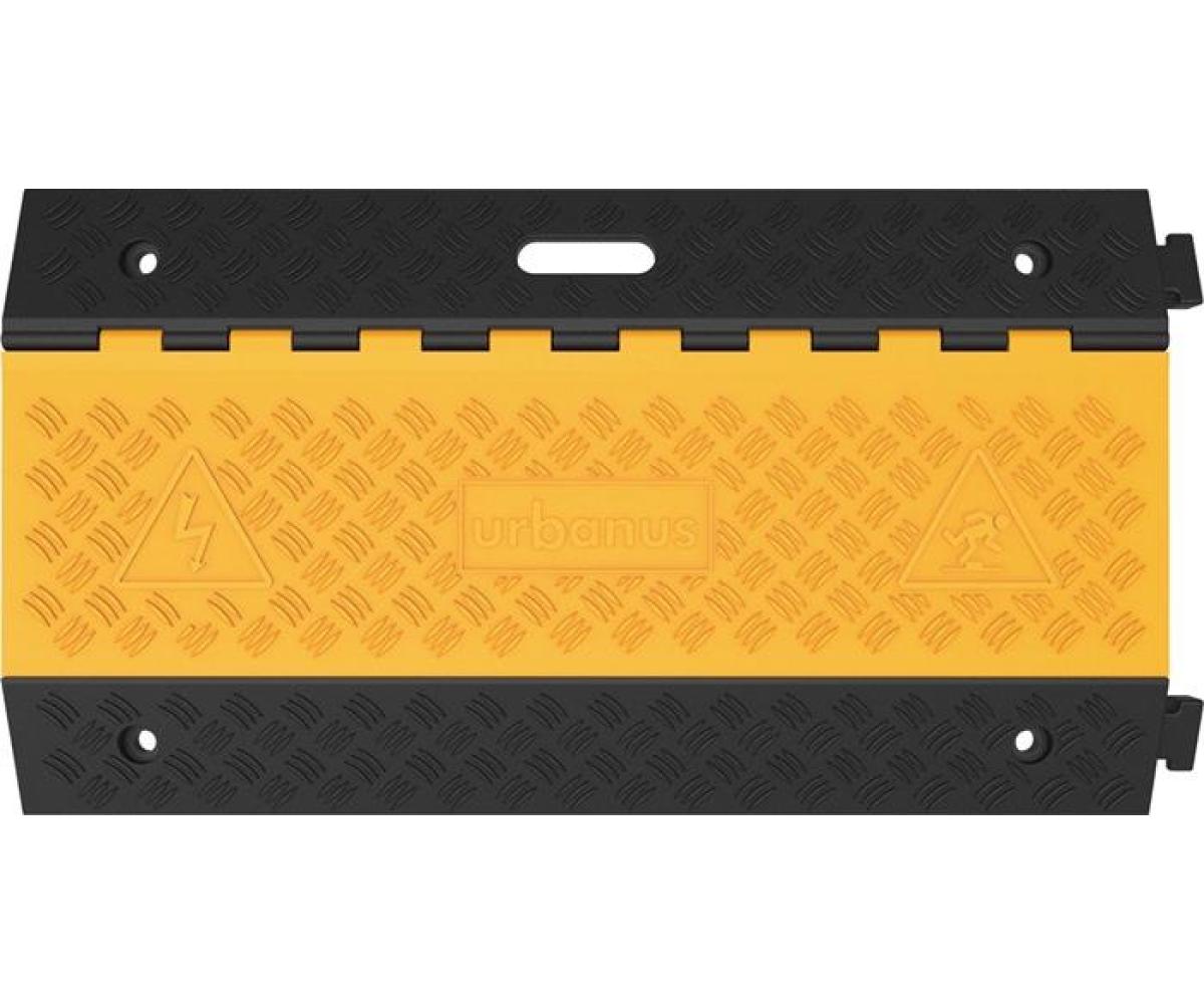 mit fünf Kanälen · zum Schutz von Schläuchen oder Kabeln, die nicht dauerhaft verlegt sind · Abmessung Kabelkanäle H 35,3 x B 38 mm · keine Befestigung nötig · aus schwarzem vulkanisiertem Vollgummi und rutschhemmende Oberfläche · mit gelben Schutzdeckel und Tragegriff · überfahrbar bis zu einem Achsgewicht von 4 t · Endlosmontage mit Zapfen/Nut-System