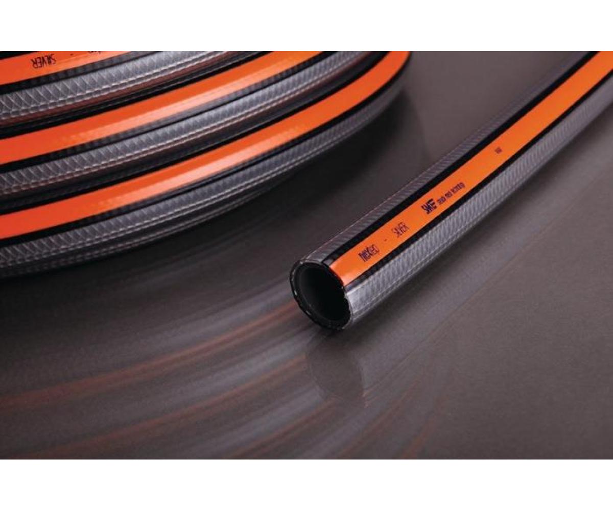 5-lagiger PVC Schlauch · frei von Algenbildung · phtalatfrei · patentierte SMT Steady Mesh Technology · Version 801 Eigenschaften: hohe Knick- und Quetschbeständigkeit Festigkeitsträger: hochfestes Polyestergarn Seele: PVC Decke: PVC, grau mit orangem Streifen Temperaturbereich: -15 Grad bis +65 Grad Einsatzbereiche: Agrarindustrie, Garten- und Landschaftsbau