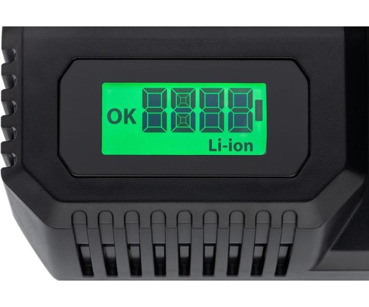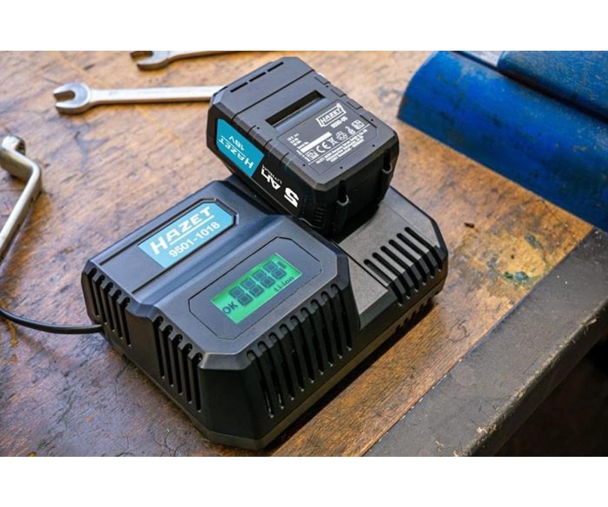 passend für 18 Volt Akkus · Laden der HAZET Li-Ionen Akku Packs 9500-025, 9500-05 · Erreichen von 80% der Ladekapazität nach ca. 30 Minuten durch spezielles Ladeverfahren · großes LCD Display zur Erkennung von Ladezustand und Batteriediagnostik (Ampelanzeige) · Ladezeit: 2,5 Ah Akku Pack ca. 40 Minuten, 5 Ah Akku Pack ca. 45 Minuten · Entladungs- und Überlastungsschutz · integrierte Akku Pack Kühlung · integrierte Punkte zur Wandmontage