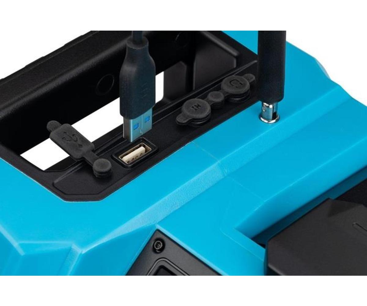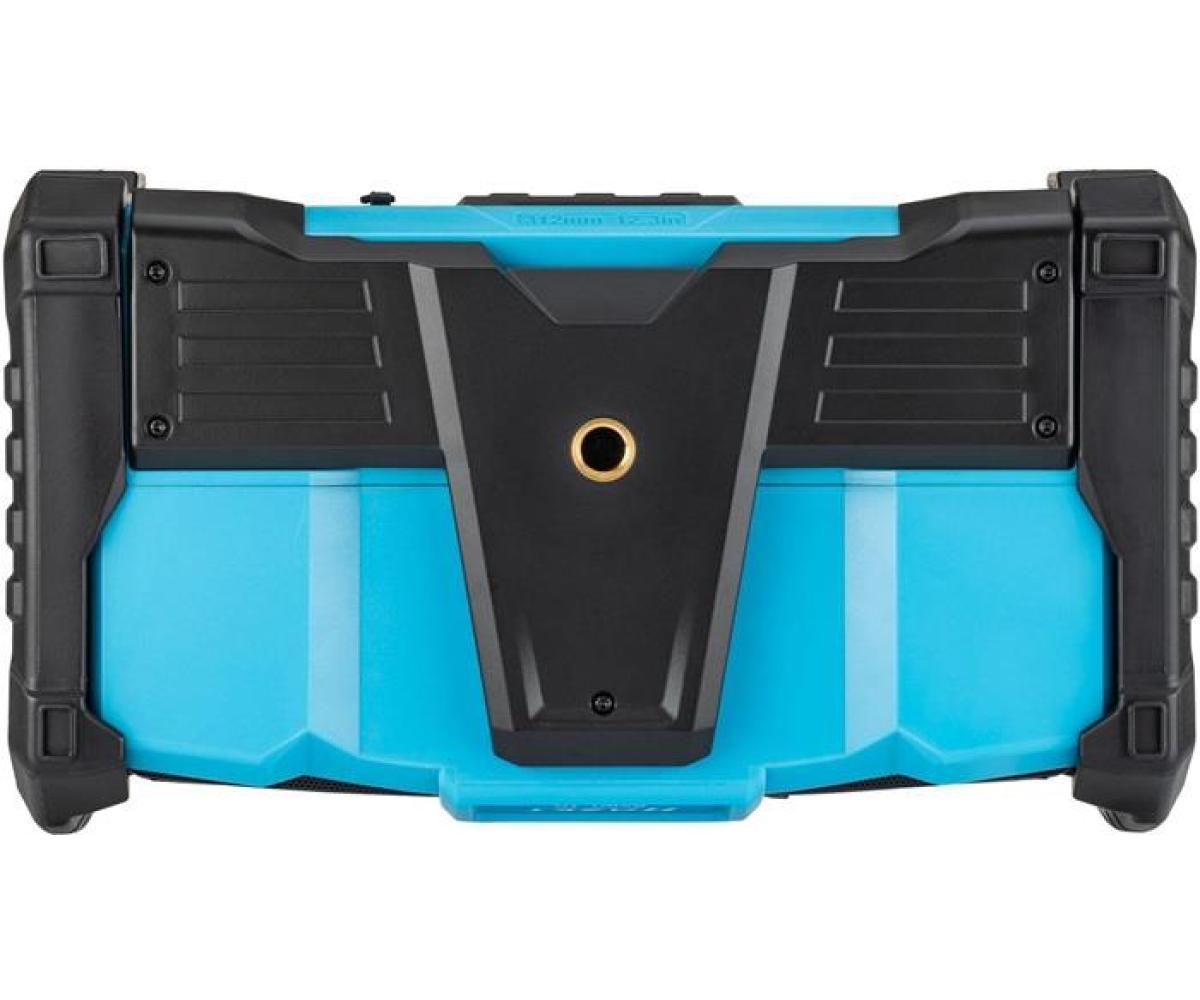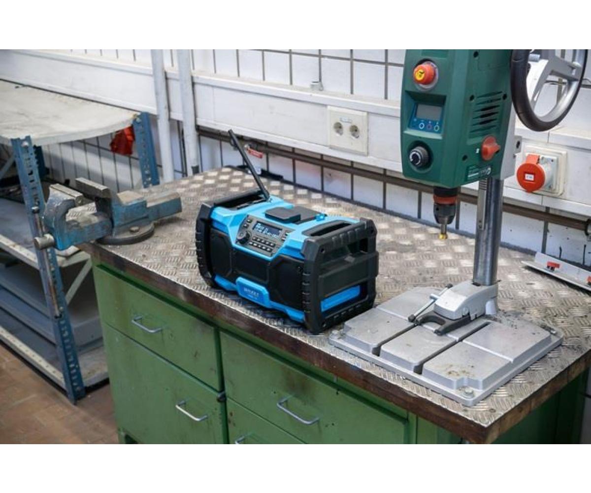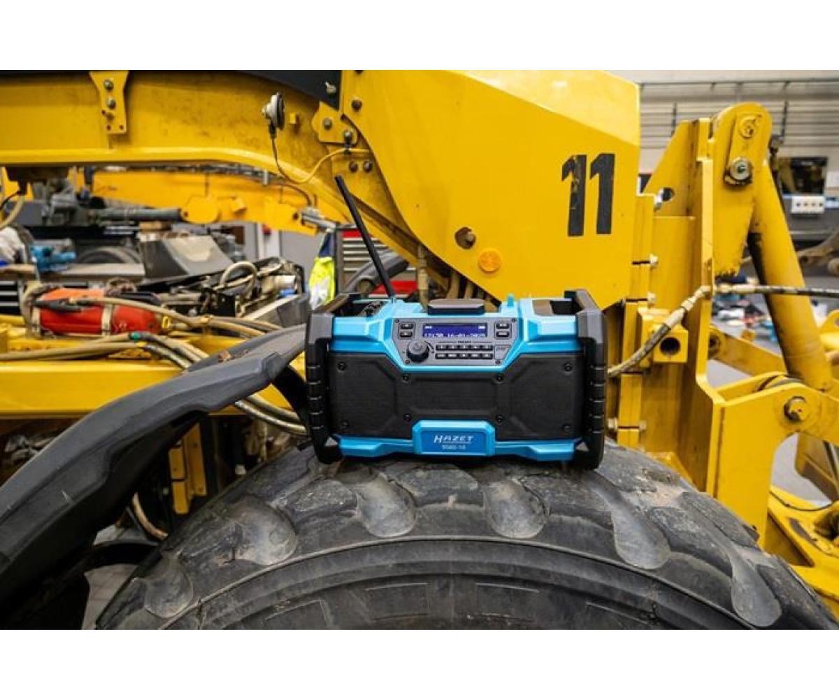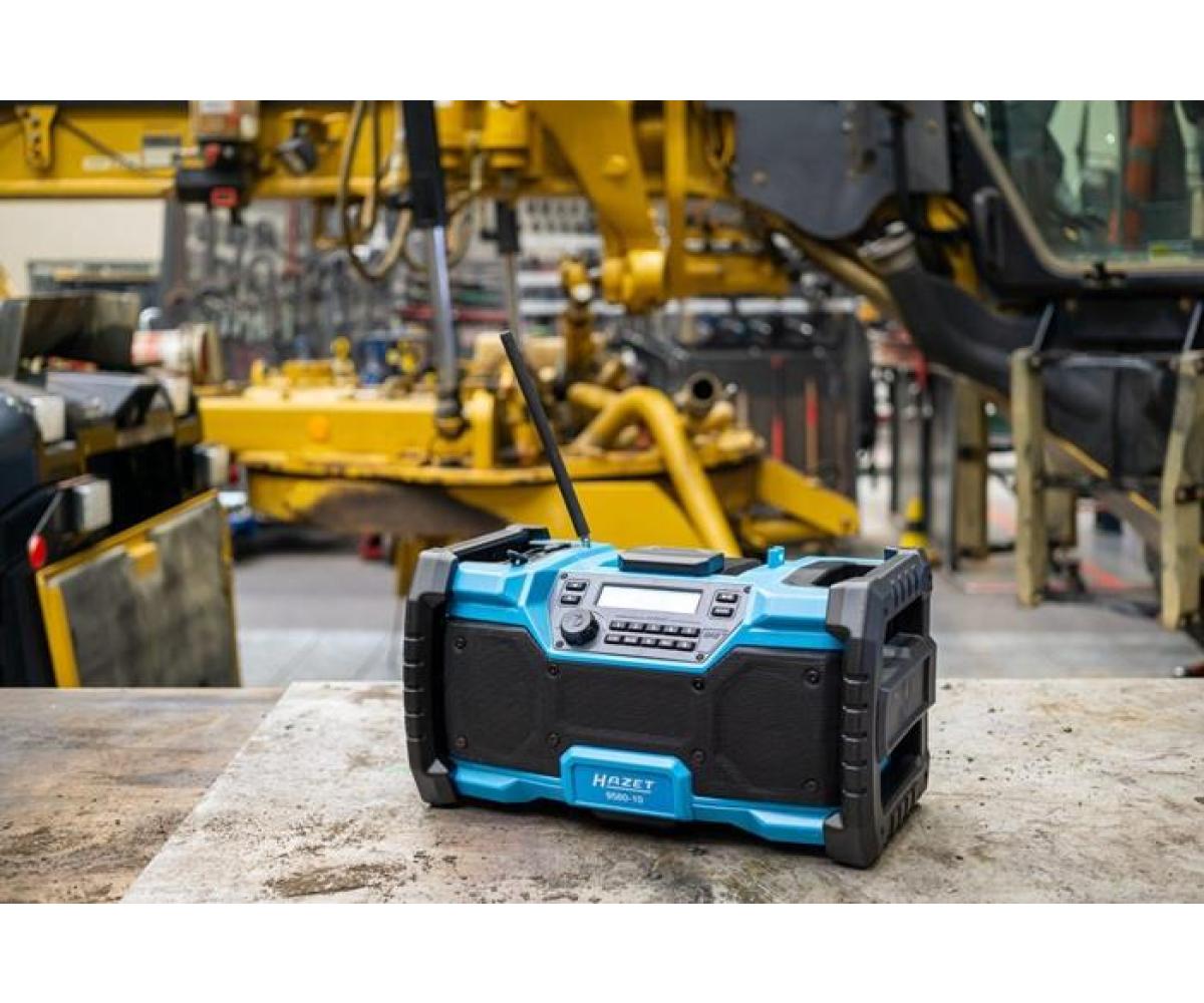 Bluetooth · Hybrid 18 Volt und 230 Volt · mit Netzteil · robustes Radio für Empfang von DAB+ (174,928 – 239,200 MHz) und FM (87,5 – 108 MHz) · Lautsprecherleistung 2x 10 Watt und Bass-Boost für Top Klangqualität · beleuchtetes LCD Display · farbiger LED Leuchtstreifen · Digitaluhr · einklappbare flexible Antenne · Bluetooth® · Aux-Eingang · USB-Anschluss · Lademöglichkeit für Smartphones, Tablets · automatische Sendersuche und 5 Programmspeicherplätze · Mute Funktion · LED-Akku Kapazitätsanzeige am Akku Pack · kompatibel mit allen 18 Volt Akku Packs der Serie 9500 · Maße: 369 mm x 212 mm x 201 mm