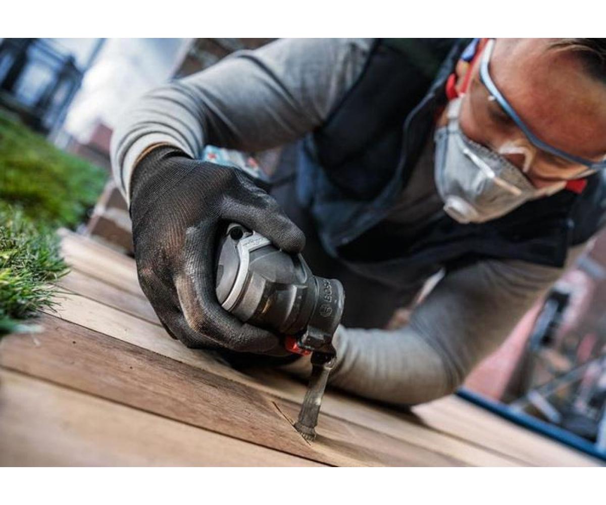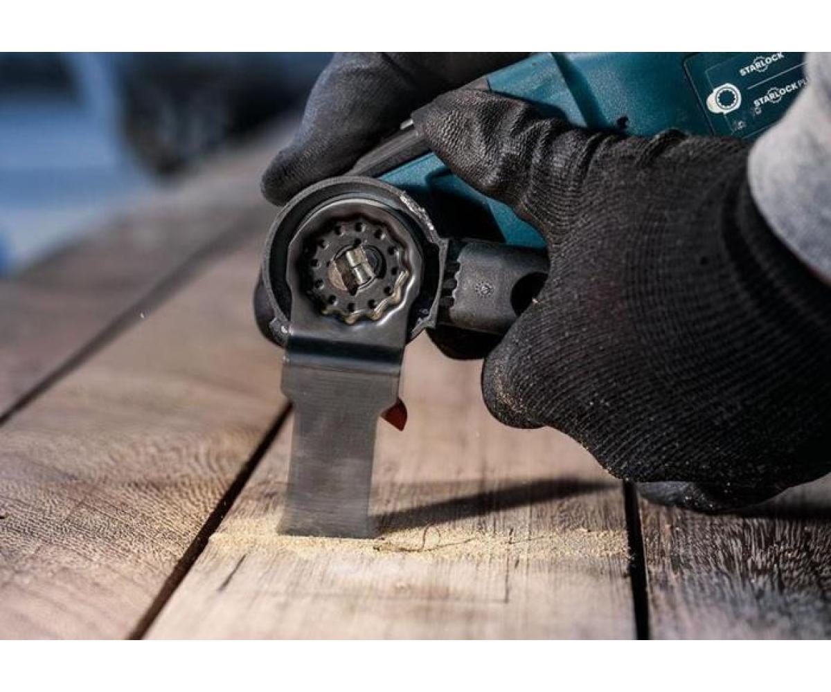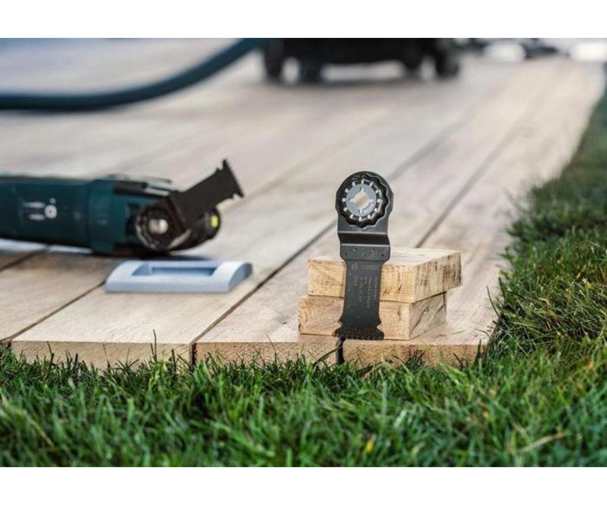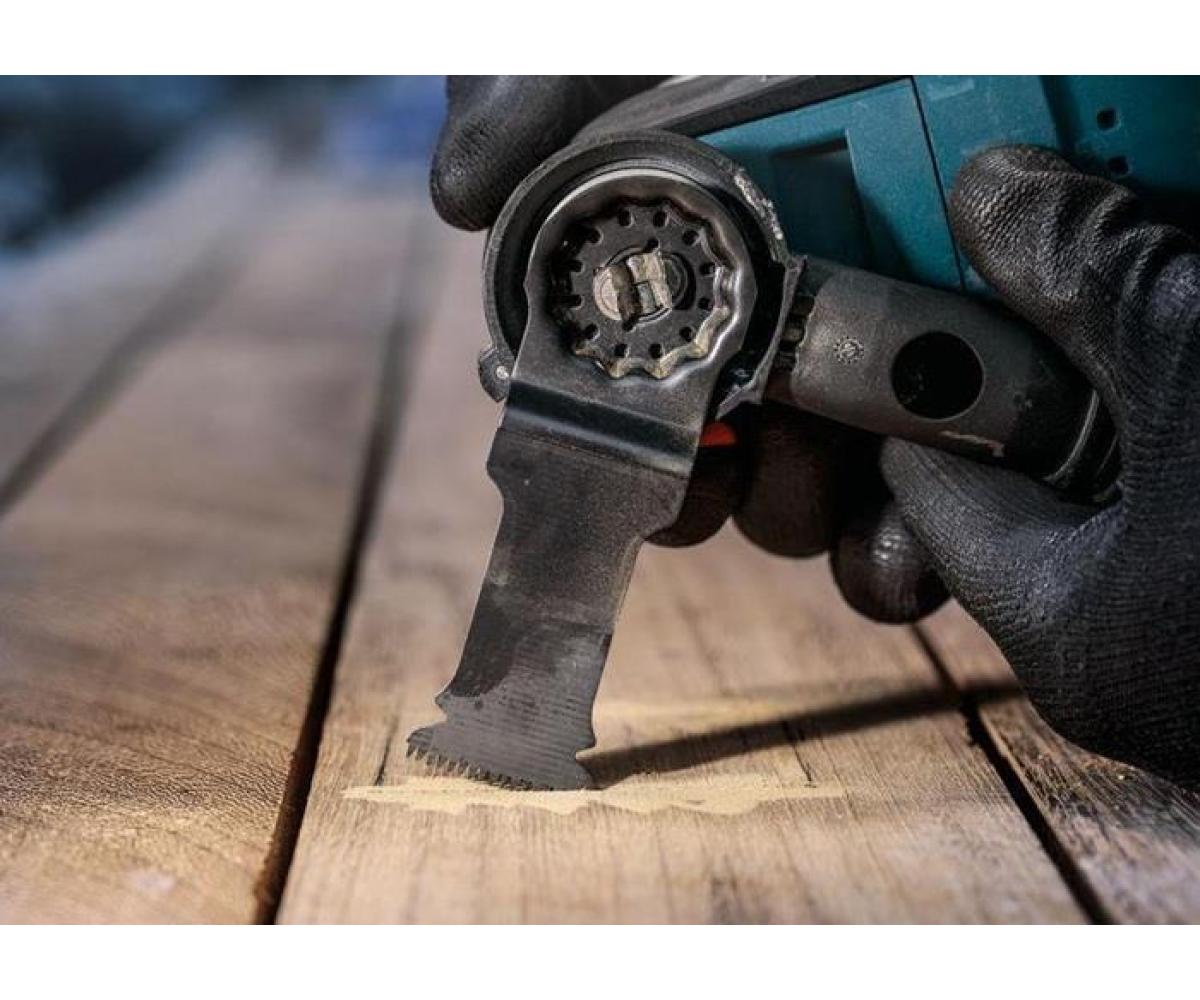 zum Schneiden in Hartholz und abrasiven Holzwerkstoffen, sowie für Tauchschnitte in Hartholz und Holzverbundwerkstoffen · Bi-Metall Blatt kombiniert harte Zähne (japanisch) mit flexiblem Blattkörper · ermöglicht aggressive und schnelle Schnitte mit wenigen Hitzespuren · Curved-Tec-Design: deal für ausrissfreie Tauchschnitte