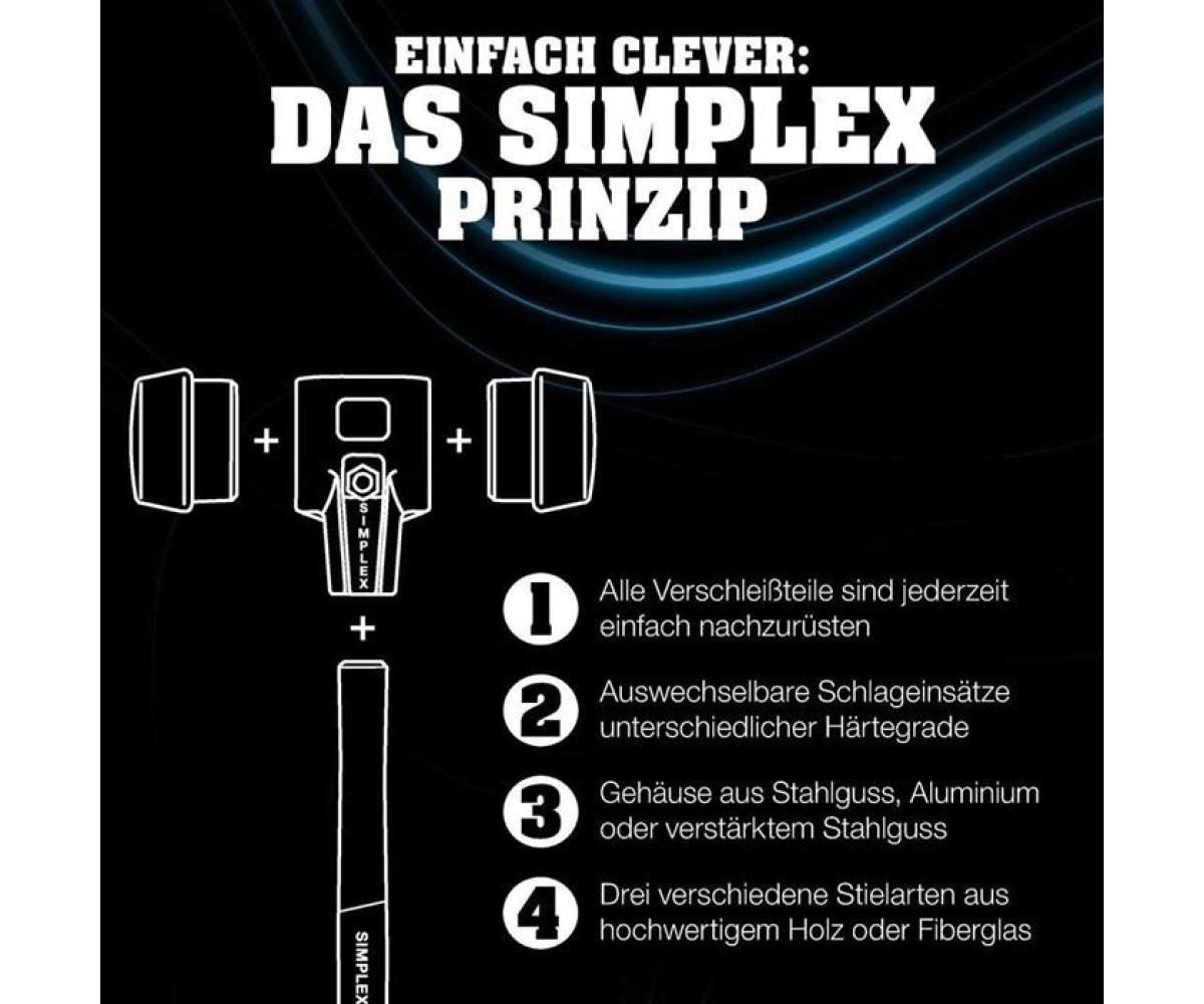 2-teiliges Spanngehäuse aus Aluminium · Schlageinsätze und Simplex-Stiel sind leicht auswechselbar durch Lösen bzw. Spannen der Innensechskant-Spannschraube · Schlagköpfe abriebfrei · extra leich, dank Aluminiumgehäuse · je 1 Stück überdimensionale Einsätze aus TPE-Soft, blau (weich) und Superplastik, weiß (mittelhart)