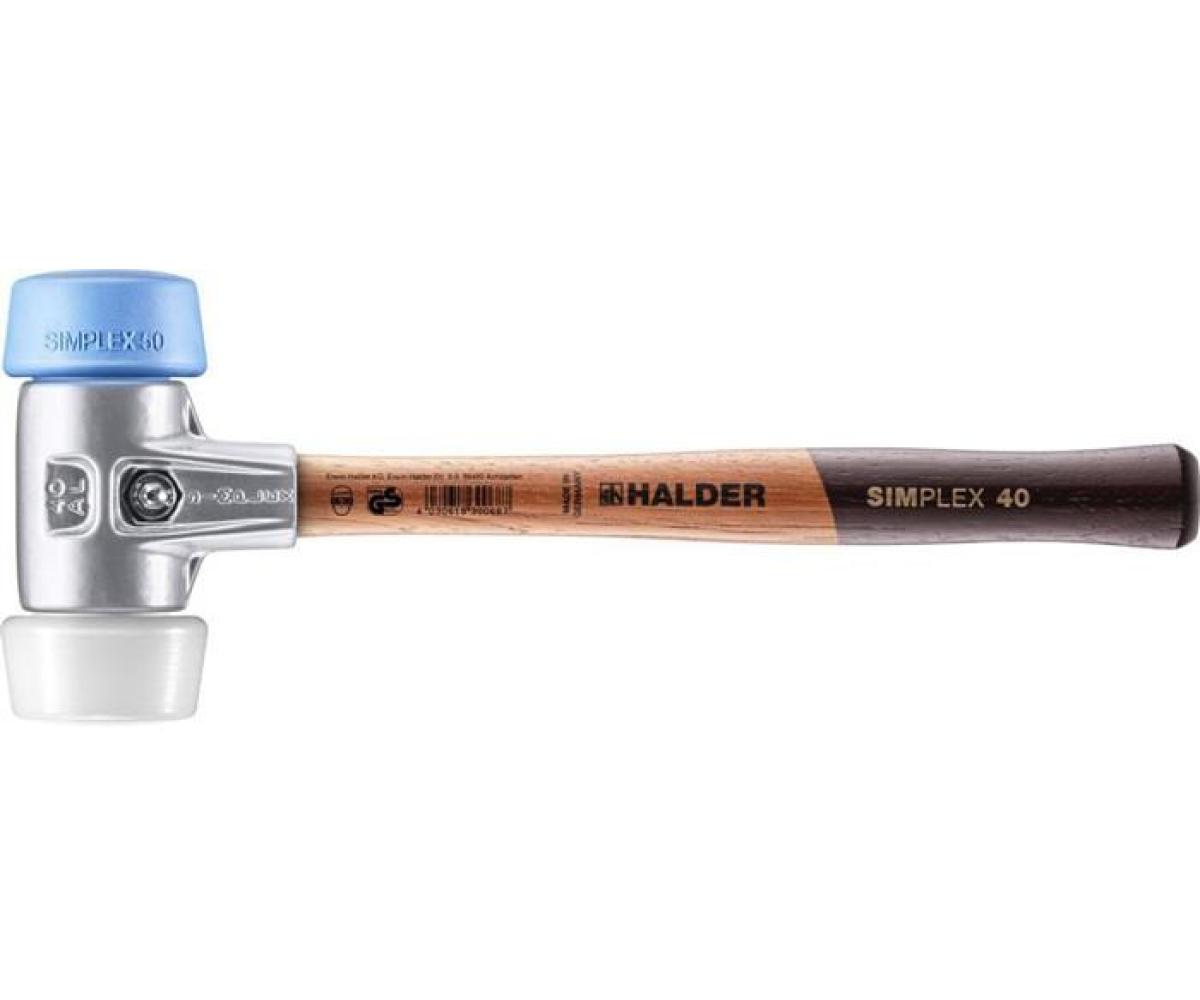 Weitere technische Eigenschaften · Stiel: Holz · Schlag: weich/mittelhart · Einsätze: TPE-soft/Superplastic · Bezeichnung: SIMPLEX-Schonhammer, 50:40 · Breite: 120mm · Gehäuse: Aluminium Al · GS: ja · Härtegrad Schlageinsatz 1: 1 / 5 · Härtegrad Schlageinsatz 2: 3 / 5 · Höhe: 50mm · Konfliktmineralien frei: Frei von Konfliktmineralien: Dieses Produkt enthält keine als "Konfliktmineralien" bezeichneten Stoffe wie Tantal, Zinn, Gold oder Wolfram aus der demokratischen Republik Kongo oder angrenzender Länder. · Nennmaß: D=50 mm · Präferenzursprung: CE · Prop65: Enthält keine Proposition 65 Stoffe · REACH konform: enthält keine SVHC-Stoffe: Keine SVHC Substanzen mit mehr als 0,1% w/w enthalten – SVHC Liste Stand 11.07.2024. · RoHS-konform: RoHS-konform: Konform gemäß Richtlinie 2011/65/EU und Richtlinie 2015/863. · Schlageinsatz 1: (1): TPE-soft, blau, abriebfrei, weich · Schlageinsatz 2: (2): Superplastik, weiß, mittelhart, sehr widerstandsfähig, verschleißfest · Schonhammer SIMPLEX · L.330mm Kopf-D.50mm · weich/mittelhart HO ·
