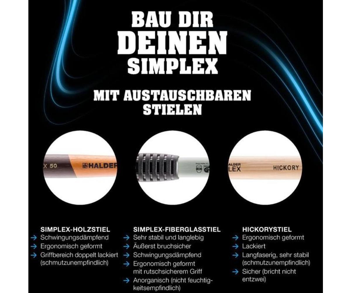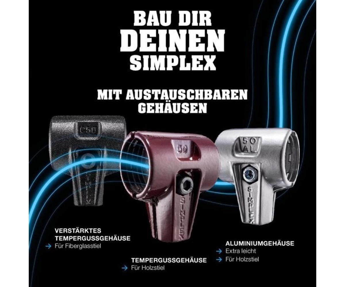 extra leichtes Aluminium-Gehäuse mit integrierter Stielschutzhülse - ideal für bruchempfindliche Materialien · Schlageinsätze und Simplex-Stiel sind leicht auswechselbar durch Lösen bzw. Spannen der Innensechskant-Spannschraube · hochwertiger, schwingungsdämpfender, ergonomisch geformter Holzstiel, Griffbereich doppelt lackiert (schmutzunempfindlich) · mit je 1 Stück Schlageinsatz aus TPE-soft, blau (weich), und TPE-mid, grau (mittelhart)