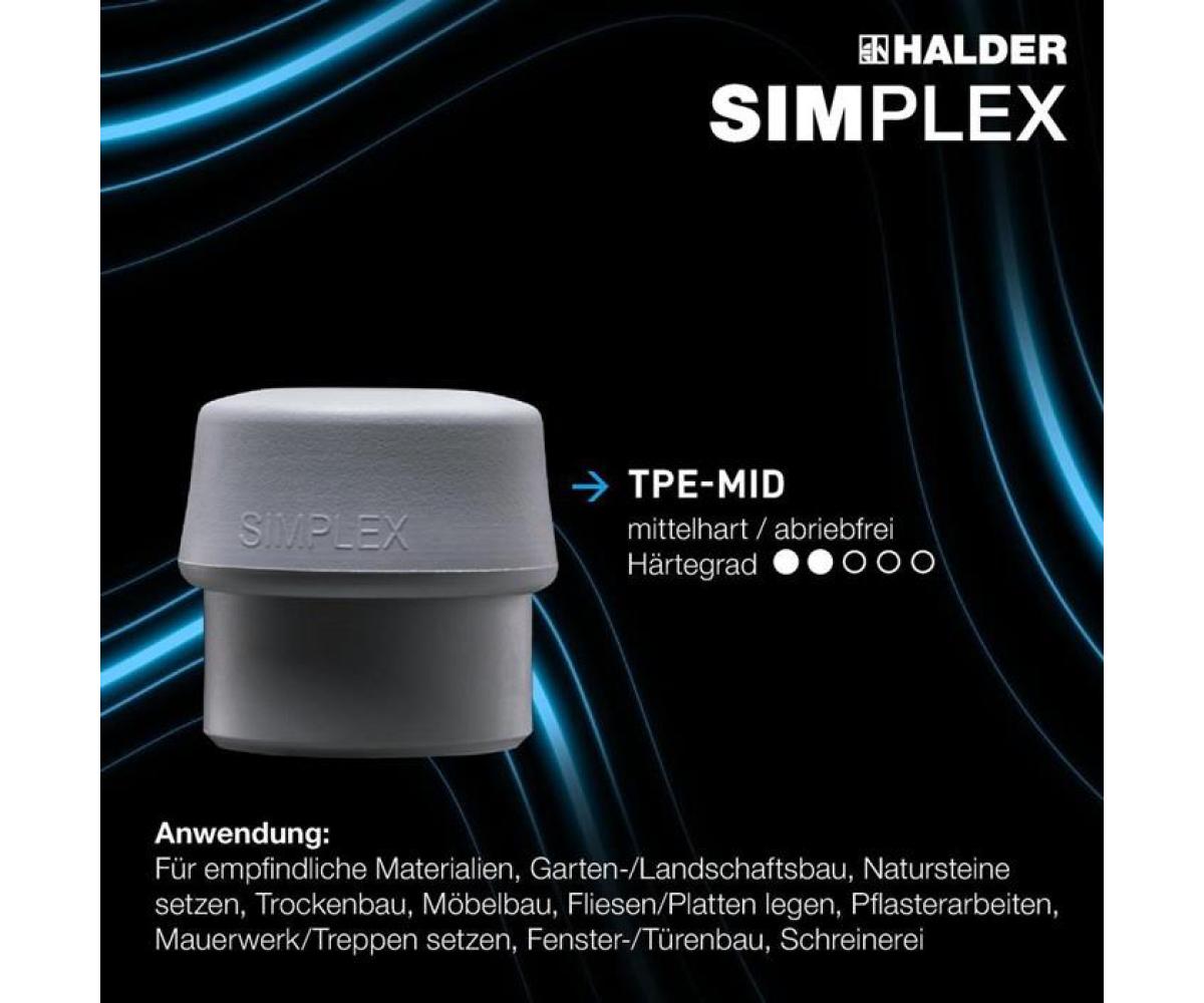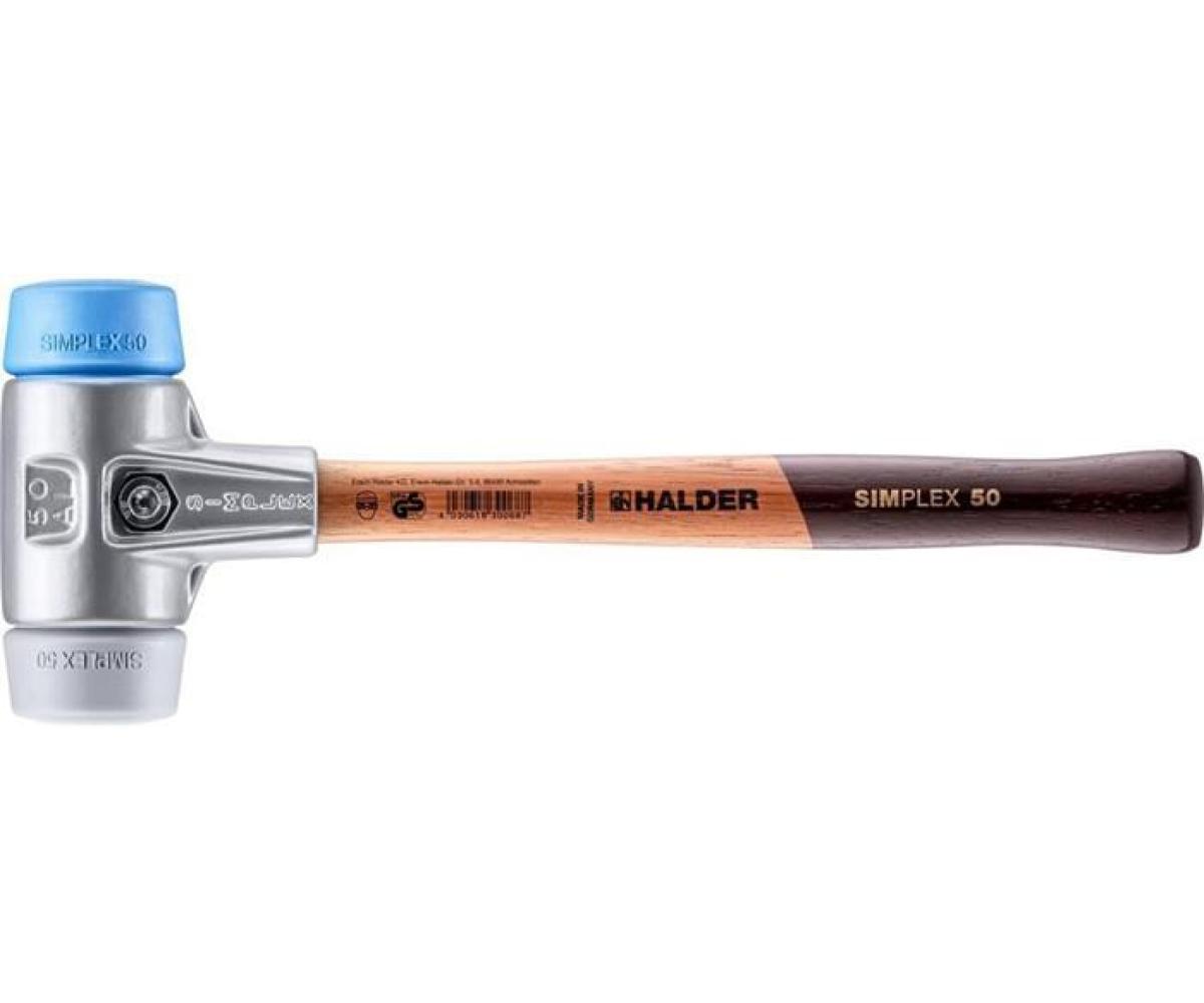 Weitere technische Eigenschaften · Stiel: Holz · Schlag: weich/mittelhart · Einsätze: TPE-soft/TPE-mid · Bezeichnung: SIMPLEX-Schonhammer · Breite: 135mm · Gehäuse: Aluminium Al · GS: ja · Härtegrad Schlageinsatz 1: 1 / 5 · Härtegrad Schlageinsatz 2: 2 / 5 · Höhe: 50mm · Konfliktmineralien frei: Frei von Konfliktmineralien: Dieses Produkt enthält keine als "Konfliktmineralien" bezeichneten Stoffe wie Tantal, Zinn, Gold oder Wolfram aus der demokratischen Republik Kongo oder angrenzender Länder. · Nennmaß: D=50 mm · Präferenzursprung: CE · Prop65: Enthält keine Proposition 65 Stoffe · REACH konform: enthält keine SVHC-Stoffe: Keine SVHC Substanzen mit mehr als 0,1% w/w enthalten – SVHC Liste Stand 11.07.2024. · RoHS-konform: RoHS-konform: Konform gemäß Richtlinie 2011/65/EU und Richtlinie 2015/863. · Schlageinsatz 1: (1): TPE-soft, blau, abriebfrei, weich · Schlageinsatz 2: (2): TPE-mid, grau, abriebfrei, mittelhart · Schonhammer SIMPLEX · L.370mm Kopf-D.50mm · weich/mittelhart HO ·