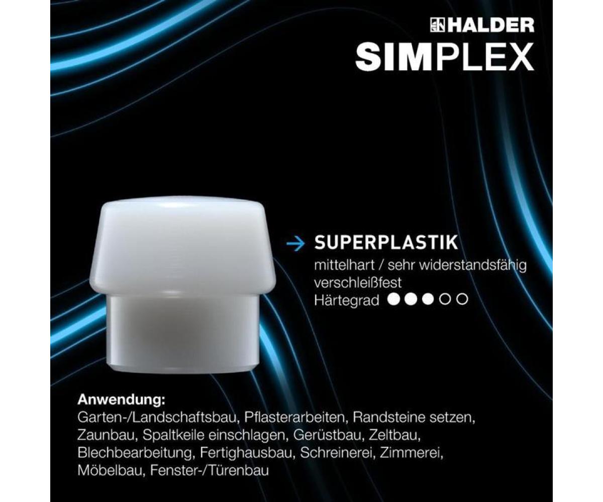 diese SIMPLEX-Plusbox Starterkit enthält den SIMPLEX-Schonhammer D60 bzw. 80 · Gummikomposition mit Standfuß / Superplastik sowie je ein TPE-soft und TPE-mid Schlageinsatz plus einen SIMPLEX-Push Flaschenöffner