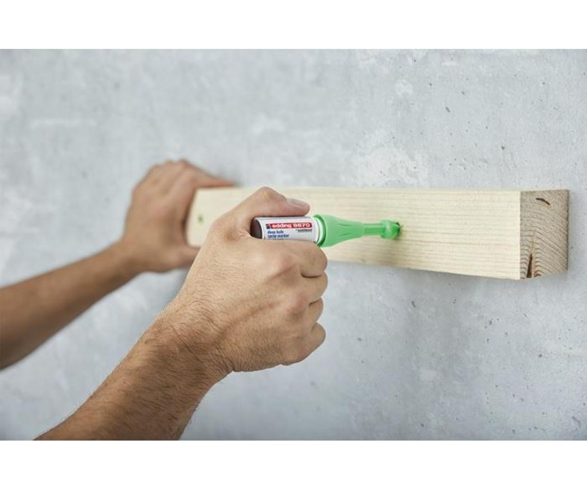 Kreidespray mit patentiertem Pumpmechanismus für nicht permanente Markierungen an schwer zugänglichen Stellen, auf fast allen Materialien · die individuell geformte Düse ermöglicht das Markieren durch Bohrlöcher bis zu 50 mm Tiefe und Ø 3 -13 mm · kann aus jedem Winkel und jeder Höhe verwendet werden, auch über Kopf · die nicht permanente Kreide lässt sich leicht von geschlossenen Oberflächen abwischen und ermöglicht schnelle Korrekturen