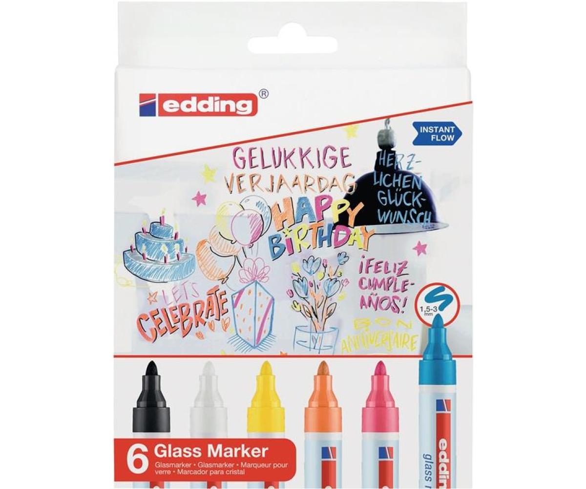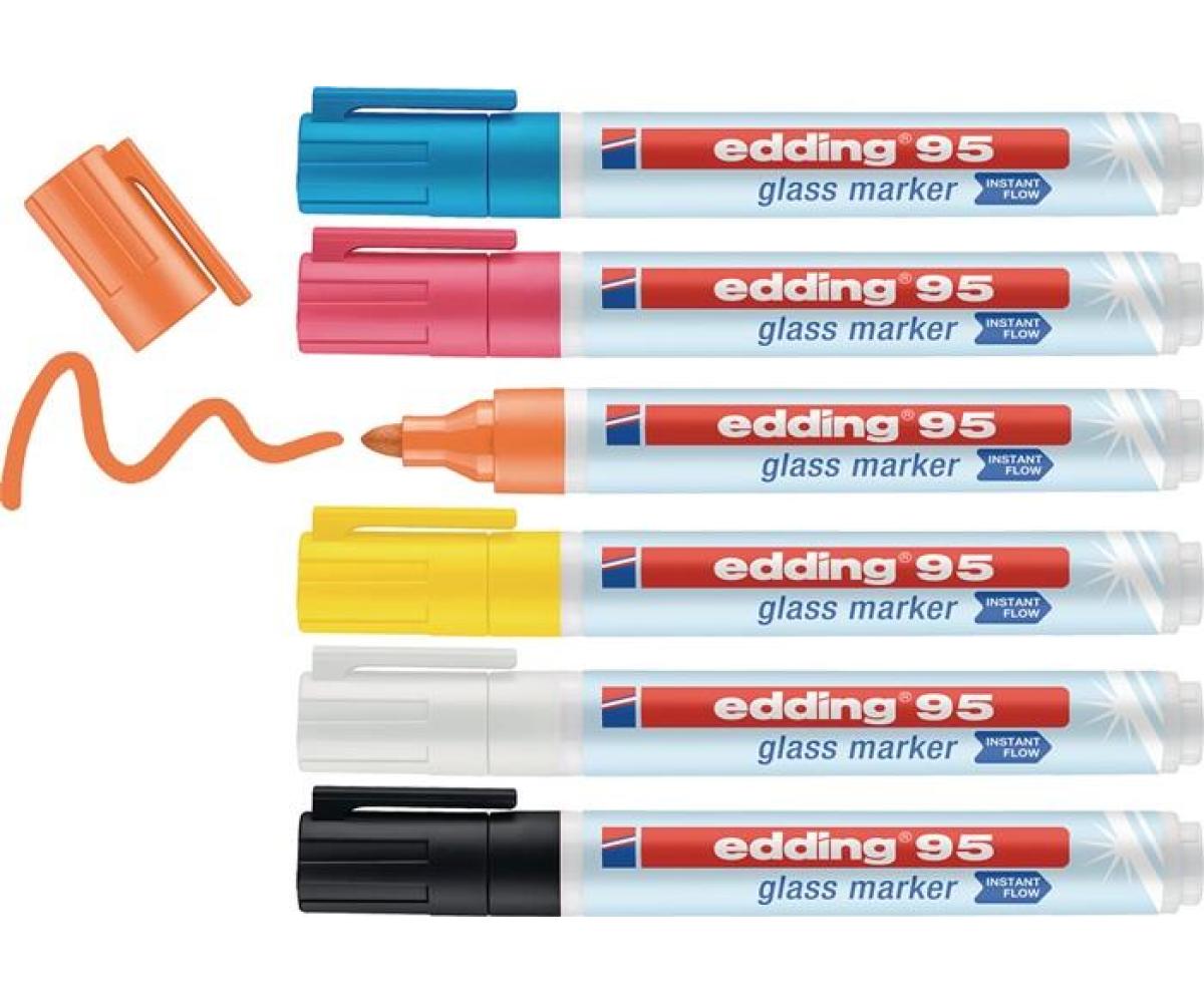 Weitere technische Eigenschaften · Höhe: 20mm · Inhalt: je 1 edding 95 in den Farben schwarz, weiß, gelb, orange, pink und hellblau · Breite: 125mm · Ausstattung: 6er Set sortiert · Glasmarker 95 · schwarz/weiß/gelb/orange/ · pink/hellblau · Rundspitze ·