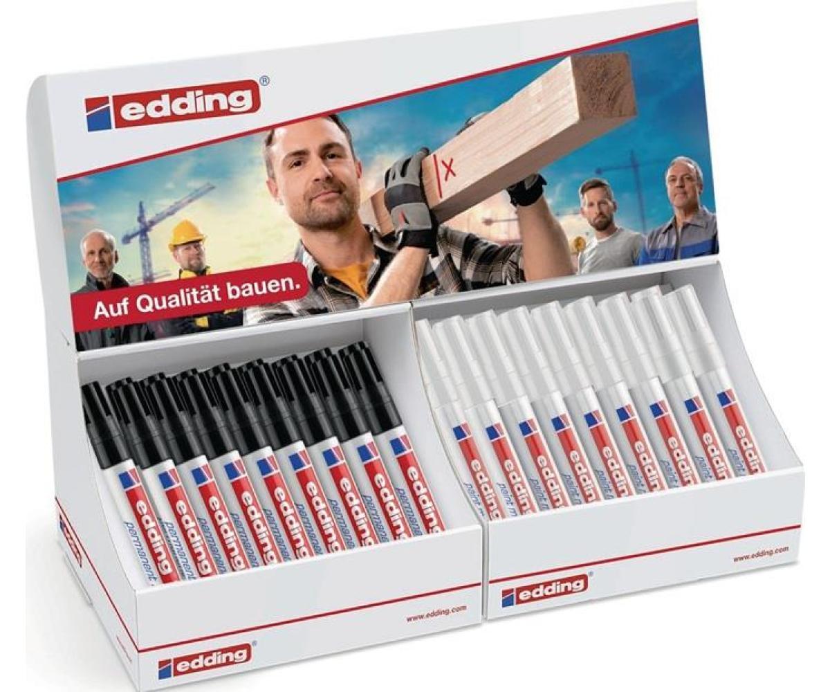 zur Thekenplatzierung mit 33x e-3000 Permanentmarker und 33x e-750 Lackmarker edding 3000 Permanentmarker schwarz: Permanentmarker zum Markieren und Beschriften fast aller Materialien, z. B. Papier, Karton, Metall, Kunststoff und Glas · wasserfest und abriebbeständig auf fast allen Oberflächen · nachfüllbar · die Tinte ist geruchsarm und ohne Zusatz von Toluol/Xylol · auswechselbare Spitzen · Aluminiumschaft edding 750 Lackmarker weiß: Lackmarker für stark deckendes und permanentes Beschriften auch von dunklen und transparenten Materialien wie z. B. Metall, Glas und Kunststoff · die lackähnliche Tinte trocknet schnell, ist witterungs- und extrem lichtbeständig sowie abriebbeständig · die Farbe ist bis 400°C hitzebeständig und gelb und weiß sind bis 1000°C noch sichtbar · Aluminiumschaft