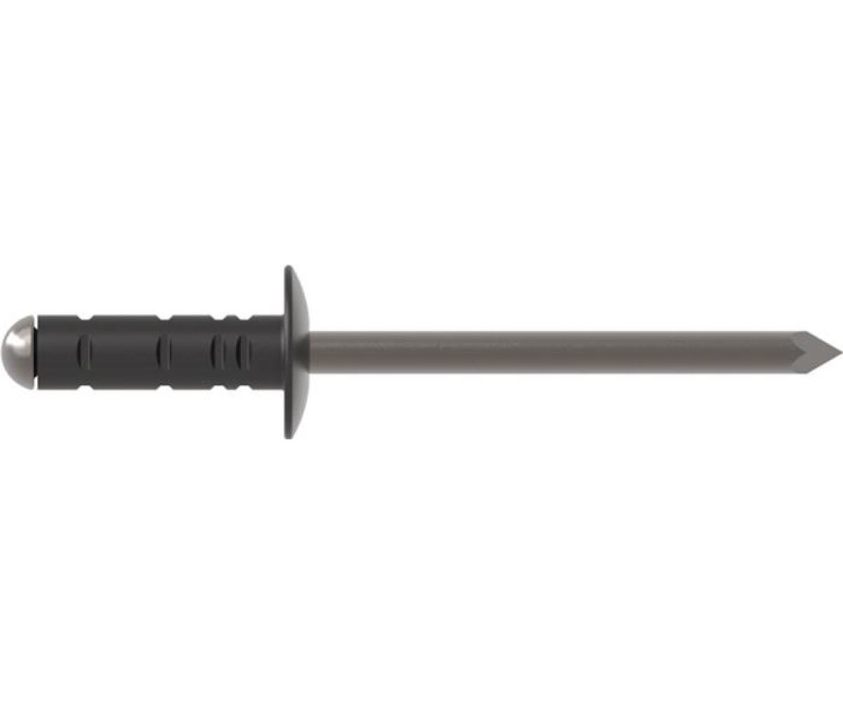 isolierend schwarz beschichtet · mit Sollbruchdorn Prüfung gemäß DIN EN ISO 14589 Standard (Flachrundkopf) Hohlniet: Aluminium-Legierung Nietdorn: Stahl, verzinkt Hinweis: wurde speziell für die Anforderungen in der Schaltschranktechnik entwickelt · durch die Restnietdornverriegelung entsteht kein Nietdornüberstand beim Setzen und beugt Verletzungen beim Einziehen von Kabeln vor · er eignet sich gut für große Bohrlöcher (Lochabdeckung erfüllt Großkopf K11,4) und verfügt zudem über einen großen Klemmbereich von 3,3 mm - 9 mm · der Niet ist isolierend beschichtet und durch die schwarze Oberfläche zur optischen Prüfung geeignet