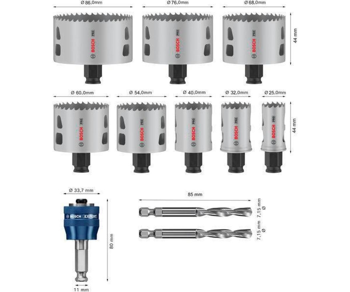 Weitere technische Eigenschaften · Verpackung: Kunststoffkoffer · Arbeitslänge: 44mm · Lochsägen-Set PRO Multi · Material PC Plus · 11-tlg.25,32,40,54,60,68, · HSS-Metall m.8% Kobalt ·