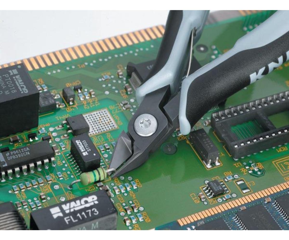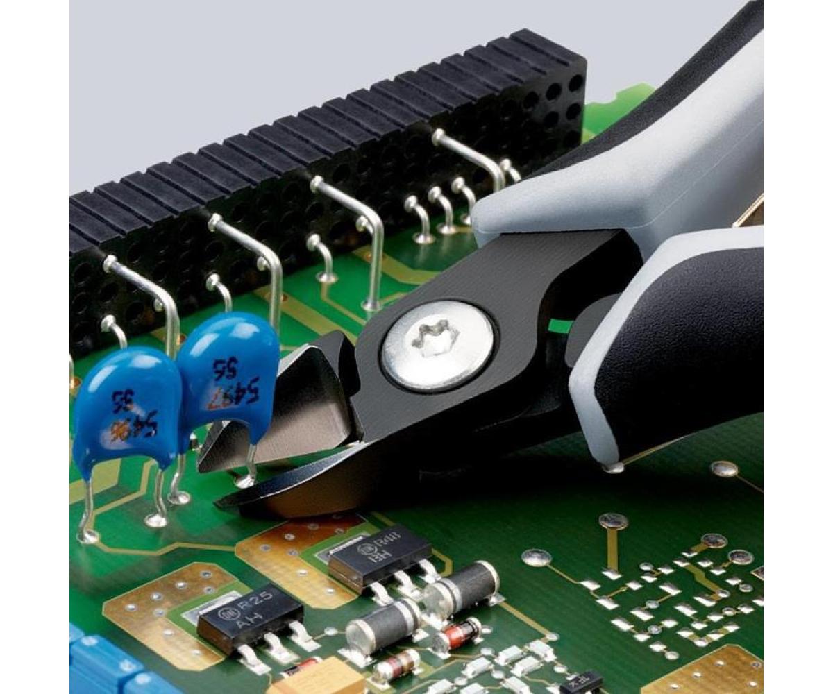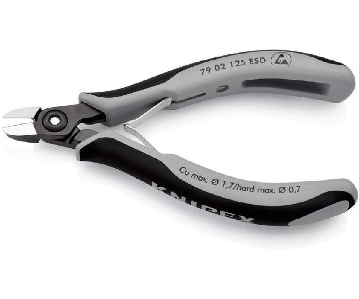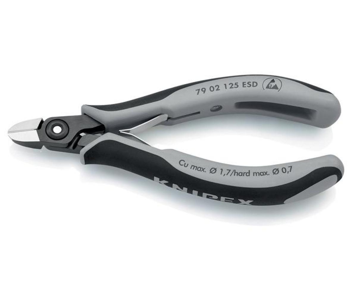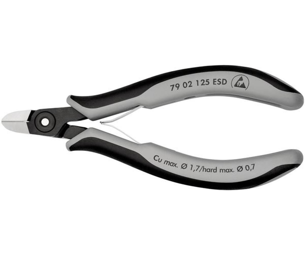 79 02 125 ESD Präzisions-Elektronik-Seitenschneider ESD Präzisionszangen für feinste Schneidarbeiten · z. B. in Elektronik und Feinmechanik. Griffe elektrisch ableitend – dissipativ. Sehr genau geschliffene · scharfe Schneiden mit sehr kleinen Facetten für exakte Schnitte an empfindlichen Elektronik-Bauteilen · auch ohne Facette für bündiges Schneiden. Präzisions-Schneiden zusätzlich induktiv gehärtet · Schneidenhärte ca. 64 HRC. Ca. 20 % weniger Gewicht als konventionelle Elektronikzangen. Geschraubtes Gelenk mit besonders sorgfältig gefertigten Gelenkflächen für gleichmäßige · reibungsarme Bewegung im gesamten Öffnungsbereich. Leichtgängige Doppelfeder für ein sanftes und gleichmäßiges Öffnen. Ergonomisch optimierte Mehrkomponenten-Hüllen. runder Kopf. - Schneidwerte mittelharter Draht (Durchmesser): Ø 1,3mm - Schneidwerte harter Draht (Durchmesser): Ø 0,7mm - Schneidwerte weicher Draht (Durchmesser): Ø 0,2 – 1,7mm - Backenlänge (B): 10mm - Backendicke (am Gelenk) (D): 6,5mm - Kopfbreite (A): 11mm - ESD: ja