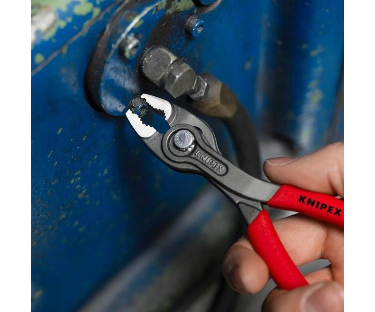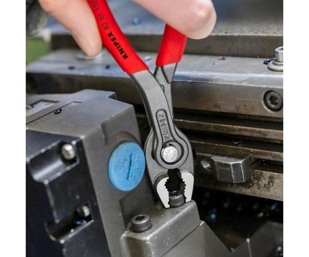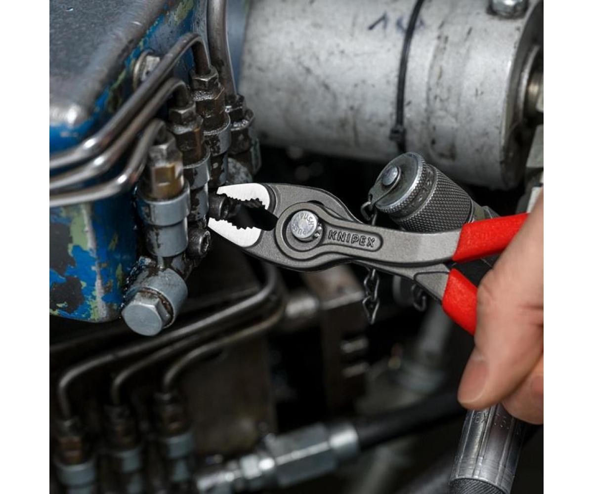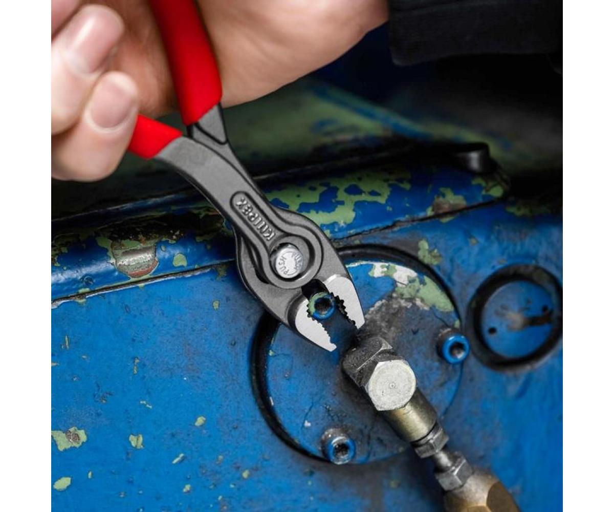 Front- und Seitengreifzange Greifen · Anziehen und Lösen von Schrauben mit verschlissenen Köpfen und Antrieben. Einzigartige Kombination: Frontgreif- und Seitengreif-Funktion · durchgestecktes Gelenk · Druckknopfverstellung. Bissiges Frontgreifmaul mit robusten Zähnen und hoher Übersetzung an der Maulspitze. Sehr schlanke und kompakte Zange: filigranes Arbeiten auch in beengten Bauräumen · mit schlanker Drehzone für schnelles Schrauben. Große Front- und Seitengreif-Kapazitäten: für Durchmesser und Schlüsselweiten 3 – 16 mm · 4 – 22 oder 5 – 27 mm. Zuverlässiges · frontales Greifen flacher Werkstücke bis 6 mm durch Dreipunkt-Anlage. Dreifach verstellbares Gleitgelenk mit Druckknopfverstellung für präzises Anpassen der Greifweite. Optimierte Geometrie des Seitengreifmauls: mit Festklemmeffekt für maximalen Grip beim Lösen und Anziehen. Klemmschutz mindert das Risiko gequetschter Finger. Langlebig und belastbar durch robustes · durchgestecktes Zangengelenk. Klein und handlich – passend auch für filigranere Arbeiten. - Einstellpositionen: 3 - Kapazität für Rohre (Durchmesser): Ø 1/8 – 5/8in - Kapazität für Rohre (Durchmesser): Ø 3 – 16mm - Kapazität für Muttern · Schlüsselweite (mm): 3 – 16mm - Kapazität für Muttern · Schlüsselweite (Zoll): 1/8 – 5/8in