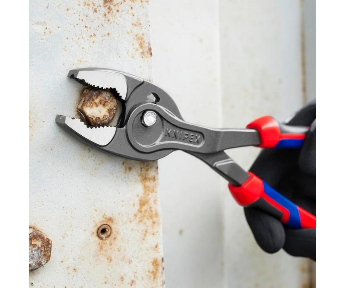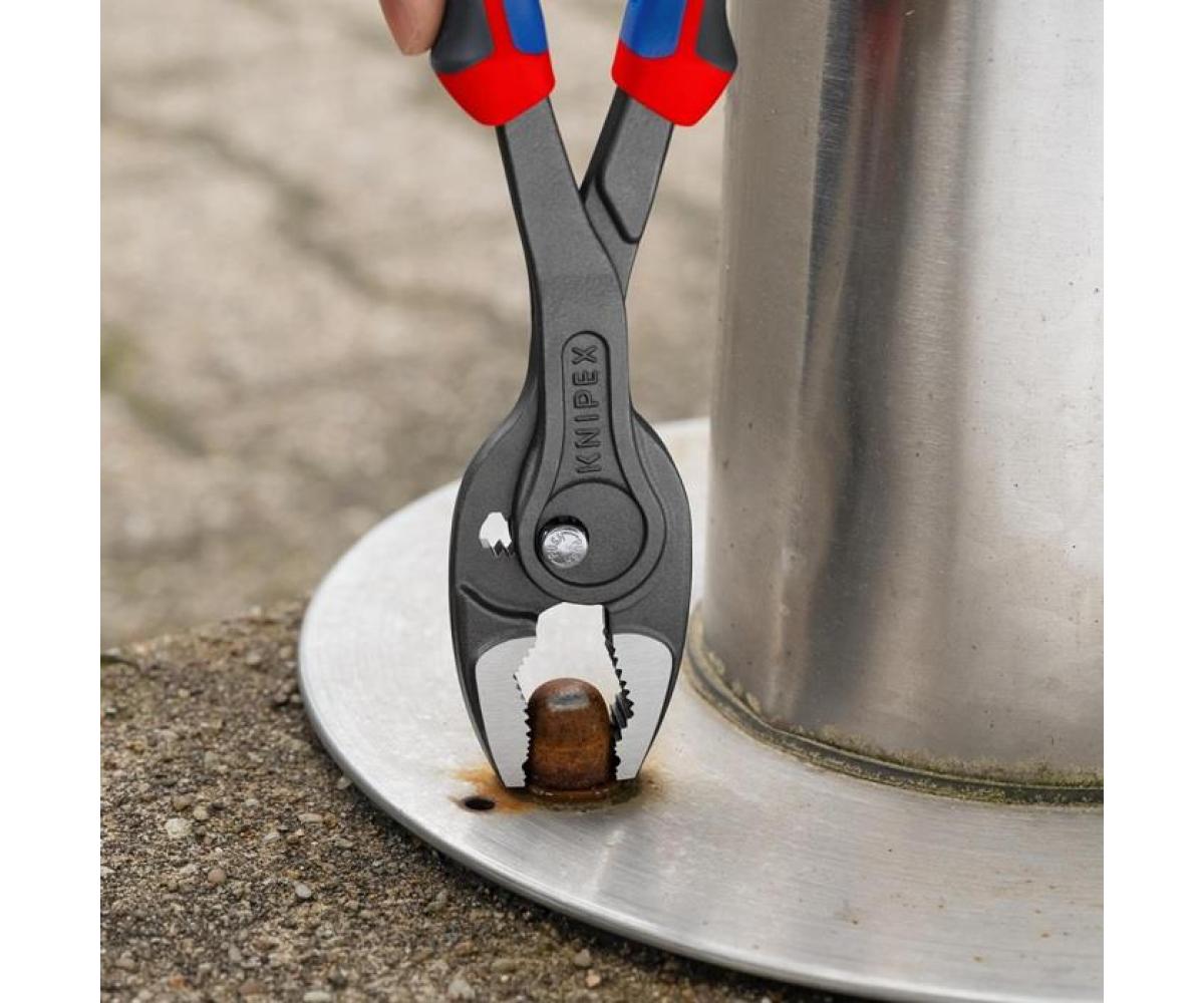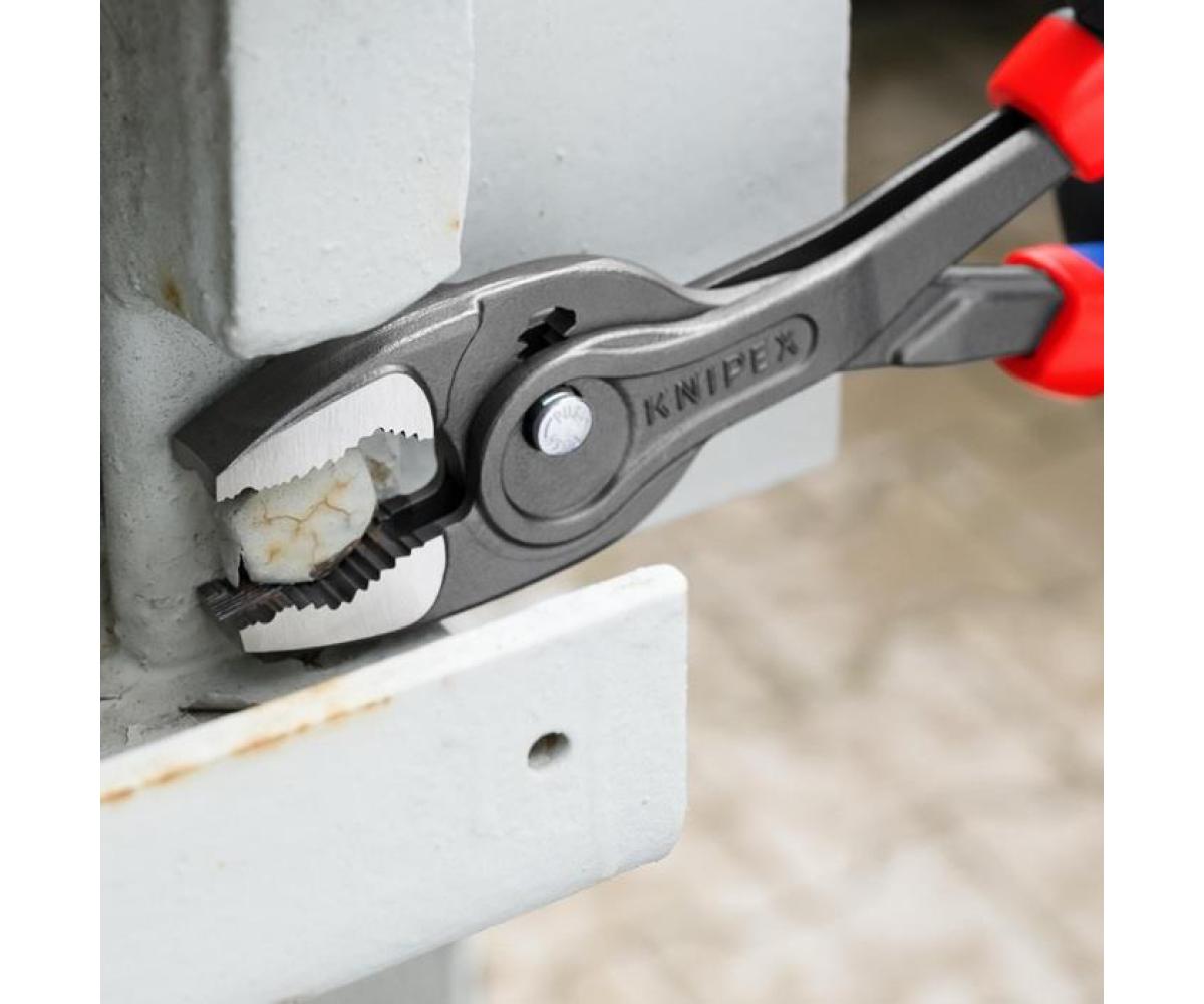 82 02 250 KNIPEX TwinGrip® Greifen · Anziehen und Lösen von Schrauben mit verschlissenen Köpfen und Antrieben. Einzigartige Kombination: Frontgreif- und Seitengreif-Funktion · durchgestecktes Gelenk · Druckknopfverstellung. Bissiges Frontgreifmaul mit robusten Zähnen und hoher Übersetzung an der Maulspitze. Sehr schlanke und kompakte Zange: filigranes Arbeiten auch in beengten Bauräumen · mit schlanker Drehzone für schnelles Schrauben. Große Front- und Seitengreif-Kapazitäten: für Durchmesser und Schlüsselweiten 5 – 27 mm. Zuverlässiges · frontales Greifen flacher Werkstücke bis 10 mm durch Dreipunkt-Anlage. Siebenfach verstellbares Gleitgelenk mit Druckknopfverstellung für präzises Anpassen der Greifweite. Klemmschutz mindert das Risiko gequetschter Finger. Langlebig und belastbar durch robustes · durchgestecktes Zangengelenk. Greift kraftvoll auch große · sehr fest- und tiefsitzende Bauteile mit SW 5 - 27 mm. Mit Comfort-Griffen: aus drei ergonomischen Komponenten für optimierte Handhabung und mit zwei KNIPEXtend-Schnittstellen für Erweiterungen. - Einstellpositionen: 7 - Kapazität für Rohre (Durchmesser): Ø 1/16 – 13/64in - Kapazität für Rohre (Durchmesser): Ø 5 – 27mm - Kapazität für Muttern · Schlüsselweite (mm): 5 – 27mm - Kapazität für Muttern · Schlüsselweite (Zoll): 13/64 – 1/16in