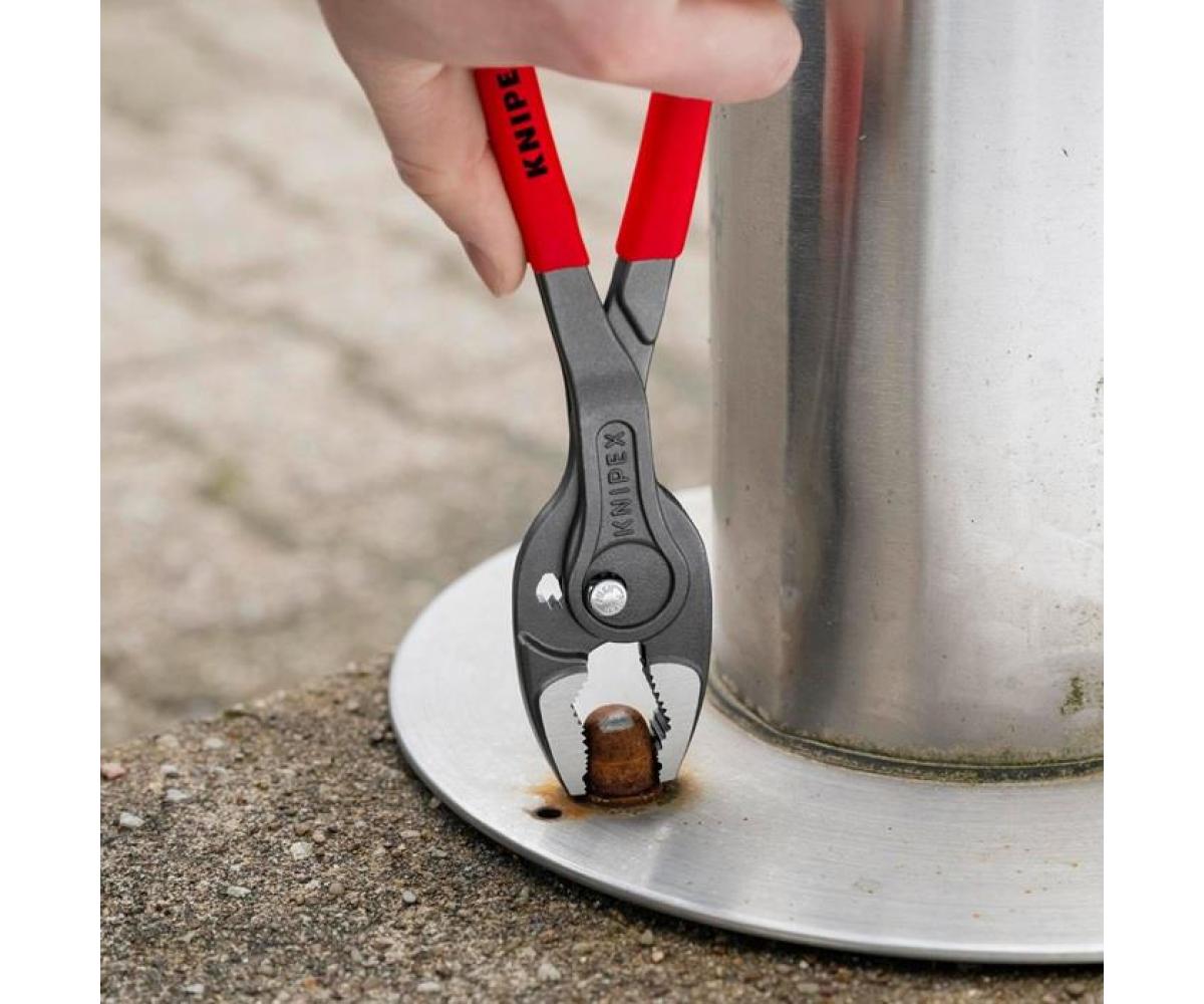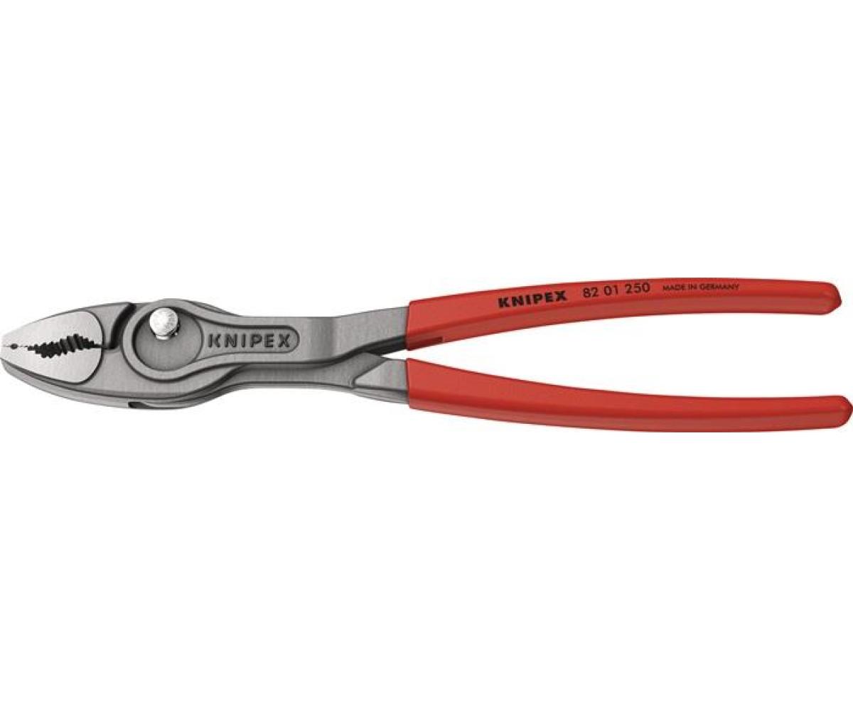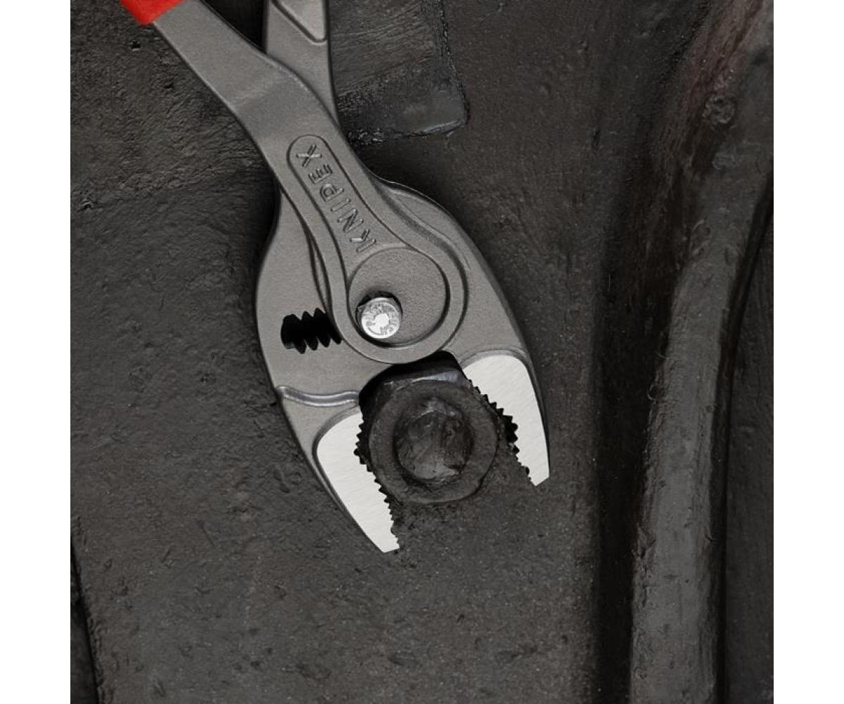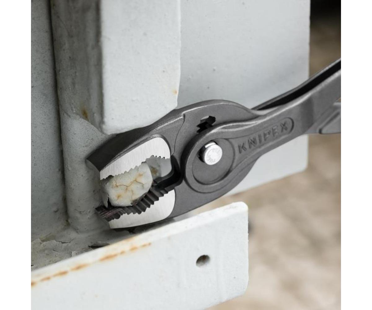 82 01 250 KNIPEX TwinGrip® Greifen · Anziehen und Lösen von Schrauben mit verschlissenen Köpfen und Antrieben. Einzigartige Kombination: Frontgreif- und Seitengreif-Funktion · durchgestecktes Gelenk · Druckknopfverstellung. Bissiges Frontgreifmaul mit robusten Zähnen und hoher Übersetzung an der Maulspitze. Sehr schlanke und kompakte Zange: filigranes Arbeiten auch in beengten Bauräumen · mit schlanker Drehzone für schnelles Schrauben. Große Front- und Seitengreif-Kapazitäten: für Durchmesser und Schlüsselweiten 5 – 27 mm. Zuverlässiges · frontales Greifen flacher Werkstücke bis 10 mm durch Dreipunkt-Anlage. Siebenfach verstellbares Gleitgelenk mit Druckknopfverstellung für präzises Anpassen der Greifweite. Klemmschutz mindert das Risiko gequetschter Finger. Langlebig und belastbar durch robustes · durchgestecktes Zangengelenk. Greift kraftvoll auch große · sehr fest- und tiefsitzende Bauteile mit SW 5 - 27 mm. - Einstellpositionen: 7 - Kapazität für Rohre (Durchmesser): Ø 1/16 – 13/64in - Kapazität für Rohre (Durchmesser): Ø 5 – 27mm - Kapazität für Muttern · Schlüsselweite (mm): 5 – 27mm - Kapazität für Muttern · Schlüsselweite (Zoll): 13/64 – 1/16in