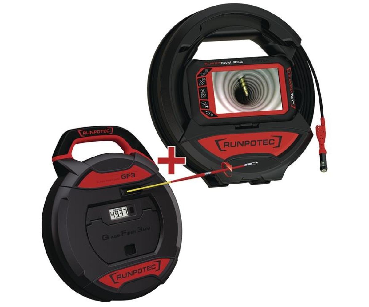 GF3 Glasfaserstab Ø 3 mm inkl. digitalem Meterzähler · Rohrinspektion ab Innen-Ø 14 mm · Inspektion von Lüftungsrohre, Drainagerohre, Abwasserrohre usw. · für Hohlrauminspektion und abgehängte Decken · Kamerakopf mit Front- und Seitenkamera inkl. 8 x LED-Lichter – dimmbar · RC3 Inspektionskamera über WLAN u. RUNPOCAM App bedienbar (optional) · Beweissicherung, Bildarchivierung, Dokumentation von Aufnahmen · Schutzklasse IP 67 (Kamerakopf und Kabel) · Akkulaufzeit 3 Stunden · Box mit Dreh- und Haltegriff · Zubehörfach (8-teilig) Enthaltenes Zubehör: 1 x RC3 Inspektionskamera (Box inkl. Monitormodul, Kabel inkl. Kamerakopf 15 m), 1 x Gewindeaufsatz RC2/RC3, Aufsatz biegsam, Glasfaserstab Ø 3 mm - 1 m, Micro Memory Card 8 GB, Verbindungsgewinde, Magnet, Fanghaken, USB-Ladekabel 1,5 m (Stecker USB/USB-C) GF3: 1 x GF3 inkl. Meterzähler in Kunststoffbox, Länge 30 m, 1 x RG7 Führungsspitze mit Drallausgleich, 1 x Knickschutz-Endhülse RTG Ø 6 mm, 1 x Einziehhilfe, 1 x Spezialkleber 3 g, 1 x Kabelziehschlaufe (Ø 14 mm Außen), 6 x Klebehülse Ø 3 mm, 3 x Zugöse Ø 7 mm, 1 x Birne Ø 11 mm, 1 x Verbindungshülse, 2 x Montageschlüssel, 1 x Knopfbatterie CR2032