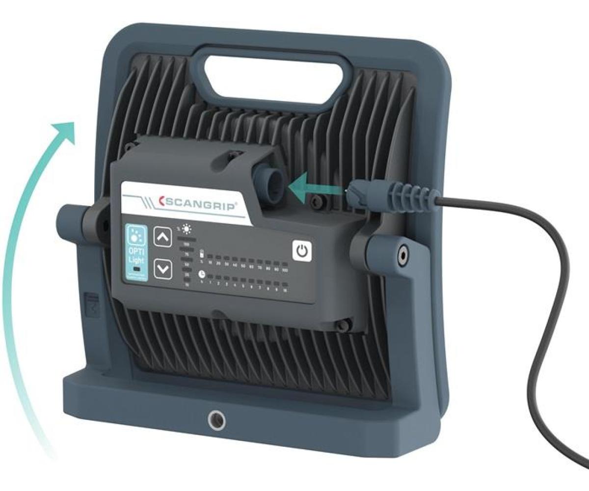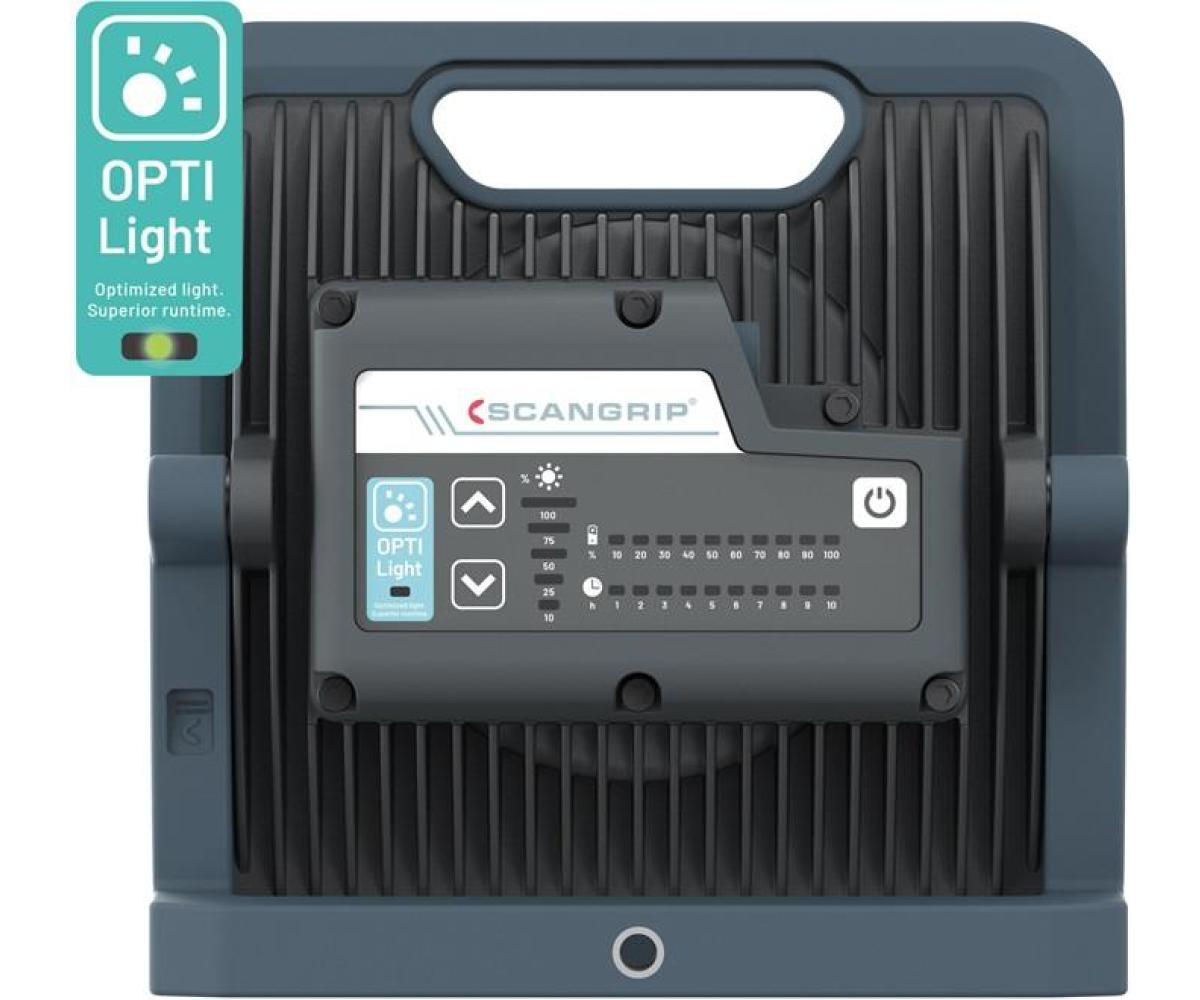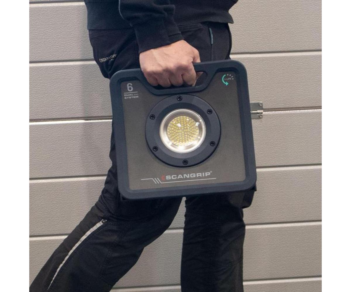 wiederaufladbare LED-Arbeitsleuchte mit 4000 Lumen · tragbar · kann mit oder ohne 5 m Gummikabel verwendet werden · wasser- und staubdicht (IP67) · mit einem integriertem Tragegriff und einer flexiblen Halterung für den einfachen Transport und zur Montage an einem SCANGRIP TRIPOD Stativ · mit 90 LEDs · einstellbare Lichtleistung · separate Anzeigen für Restlaufzeit und Batteriestand