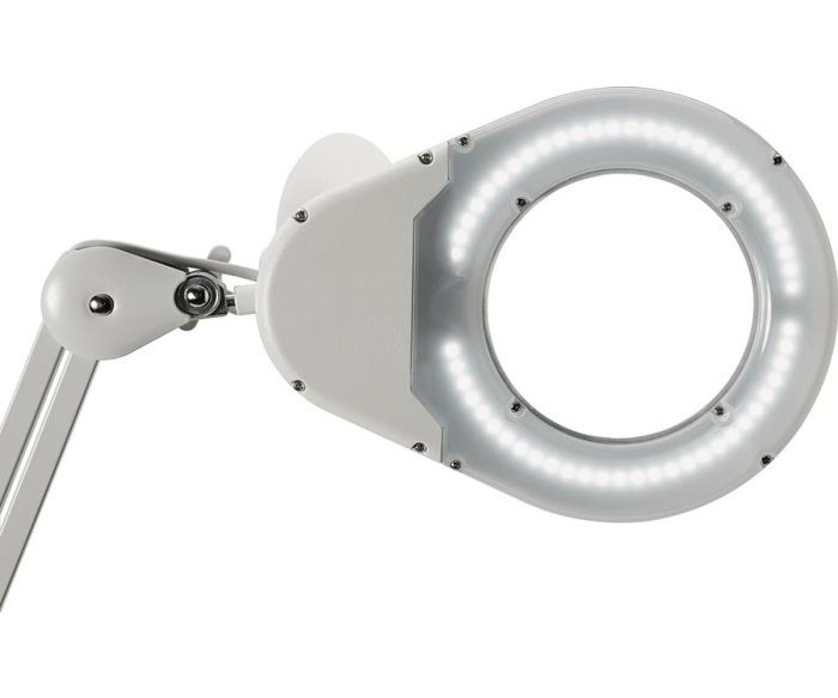 Kunststoff/Metall · mit Tischklemme oder Standfuß · Parallelogramm-Metallarm drehbar, neigbar, dreidimensional verstellbarer Kopf · 3 Dioptrien-Echtglas-Linse (1,75-fache Vergrößerung), Ø 5" (127 mm), Linsenfläche 144 cm² · Armlänge unten/oben 410 mm - Höhe 495 mm - (mit Tischklemme) · Armlänge unten/oben 310 mm - Höhe 482 mm - (mit Standfuß) · Betriebsspannung 220-240 V " Lichtfarbe 6.500 Kelvin - tageslichtweiß · gewichteter Energieverbrauch 8 kWh/1000 h · Lichtstrom 935 Lumen · Lebensdauer 50.000 Stunden · Effizienzklasse E (Spektrum A bis G)