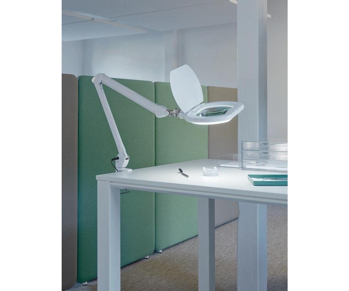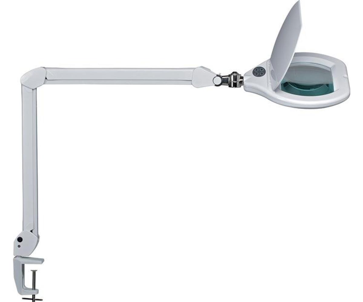 Kunststoff/Metall · mit Tischklemme · robuster Metallarm drehbar, neigbar · stufenlos dimmbar · mit Glaslinse 178 mm (7") x 132 mm (5,2"), mit Abdeckung · 3 Dioptrien-Echtglas-Linse (1,75-fache Vergrößerung), Linsenfläche 234 cm² · Armlänge unten/oben 400/440 mm - Höhe 510 mm · Betriebsspannung 220-240 V · Lichtfarbe 6.500 Kelvin - tageslichtweiß · gewichteter Energieverbrauch 18 kWh/1000 h · Lichtstrom 1868 Lumen · Lebensdauer 20.000 Stunden · Effizienzklasse F (Spektrum A bis G)