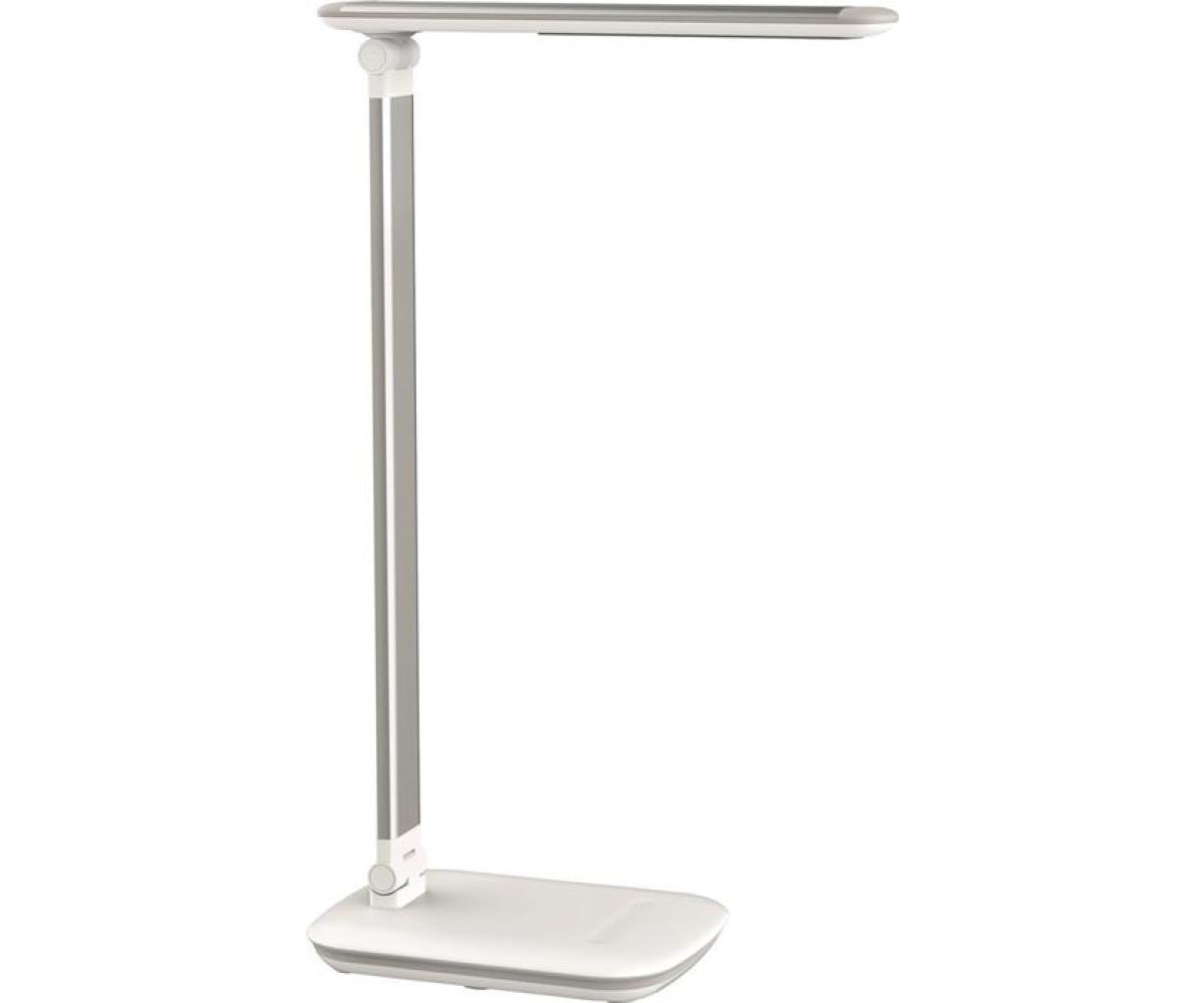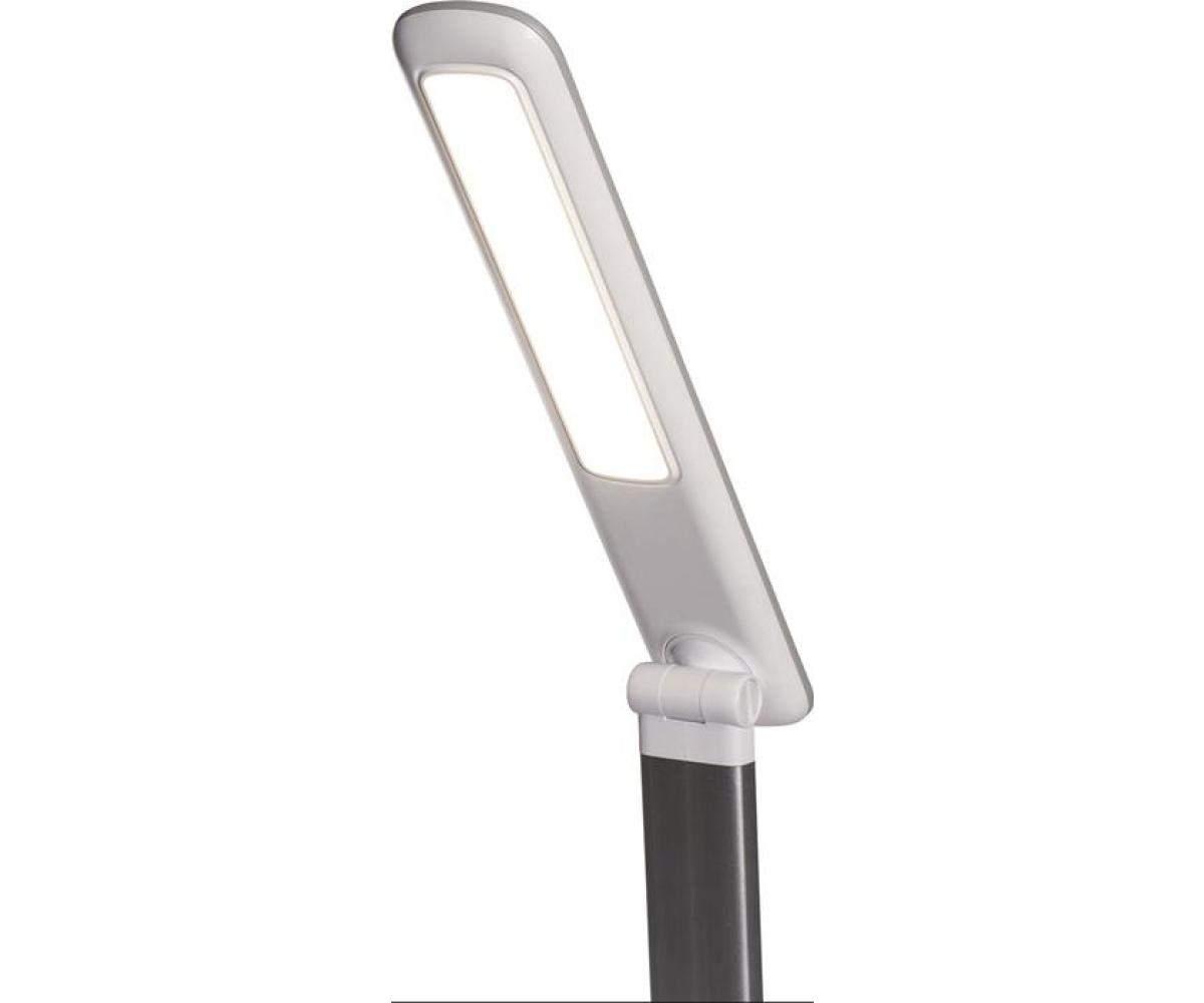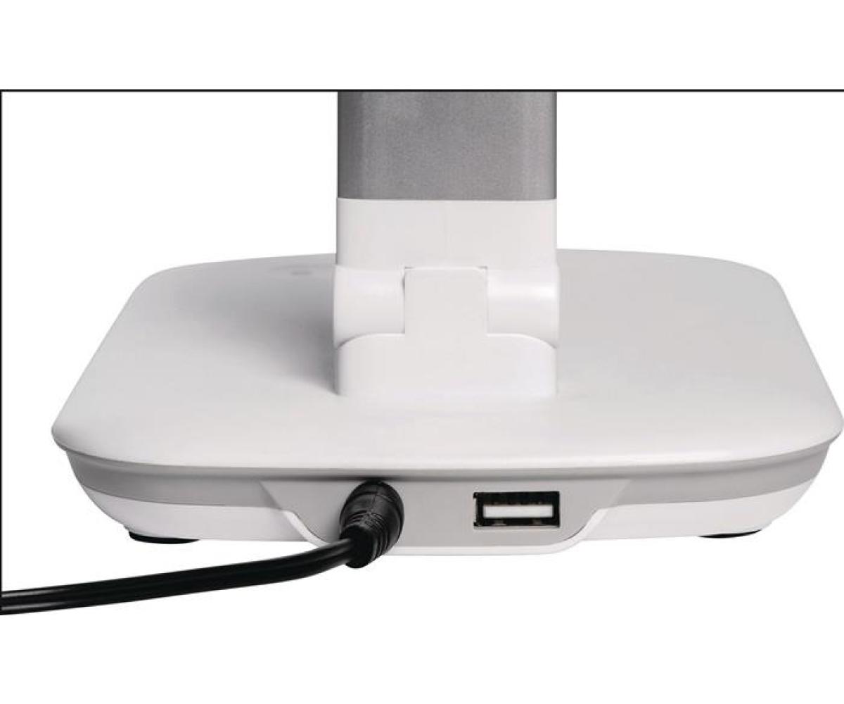 Aluminium/Kunststoff · mit Standfuß · mit integriertem 5V, max. 500 mA USB Typ A Anschluss zum Aufladen von z. B. Smartphones · 5-Stufen-Dimmer mit Touchfeld-Bedienung am Leuchtenfuß · Leuchtenkopf 260 x 50 mm – Armlänge 365 mm – Höhe 425 mm · Betriebsspannung 220 - 240 V · Lichtfarbe 4.000 Kelvin - neutralweiß · Lebensdauer 50.000 Stunden · Lichtstrom 830 Lumen · gewichteter Energieverbrauch 5 kWh/1000 h · Energieeffizienzklasse C (Spektrum A bis G)