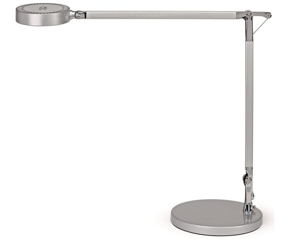 Schreibtischleuchte Metall/Aluminium · mit Standfuß · Bedienung über Touchfeld am Leuchtenkopf, stufenlos dimmbar, Diffusor für geringen Schattenwurf · Leuchtenkopf Ø 116 mm – drehbar, neigbar · Armlänge unten/oben 365 mm - Höhe max. 466 mm · Betriebsspannung 220-240 V · Lichtfarbe 3.000 Kelvin - warmweiß bis 6.500 Kelvin - tageslichtweiß · Lebensdauer 20.000 Stunden · Lichtstrom 618 Lumen · gewichteter Energieverbrauch 6 kWh/1000h · Effizienzklasse F (Spektrum A bis G)