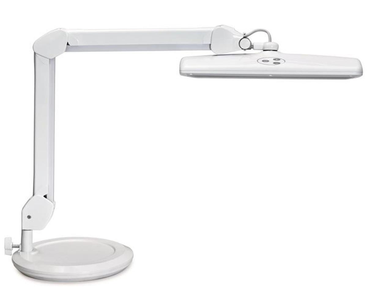 Schreibtischleuchte Metall/Kunststoff · mit Tischklemme oder Standfuß · stufenlos dimmbar - Diffusor für geringen Schattenwurf · Dreidimensional verstellbarer Leuchtenkopf · Armlänge unten 400 mm - oben 440 mm - Höhe max. 515 mm (mit Tischklemme) · Armlänge unten/oben 295 mm - Höhe max. 460 mm (mit Standfuß) · Betriebsspannung 220-240 V · Lichtfarbe 6.500 Kelvin - tageslichtweiß · Lebensdauer 20.000 Stunden · Lichtstrom 1.449 Lumen · gewichteter Energieverbrauch 11 kWh/1000h · Effizienzklasse E (Spektrum A bis G)