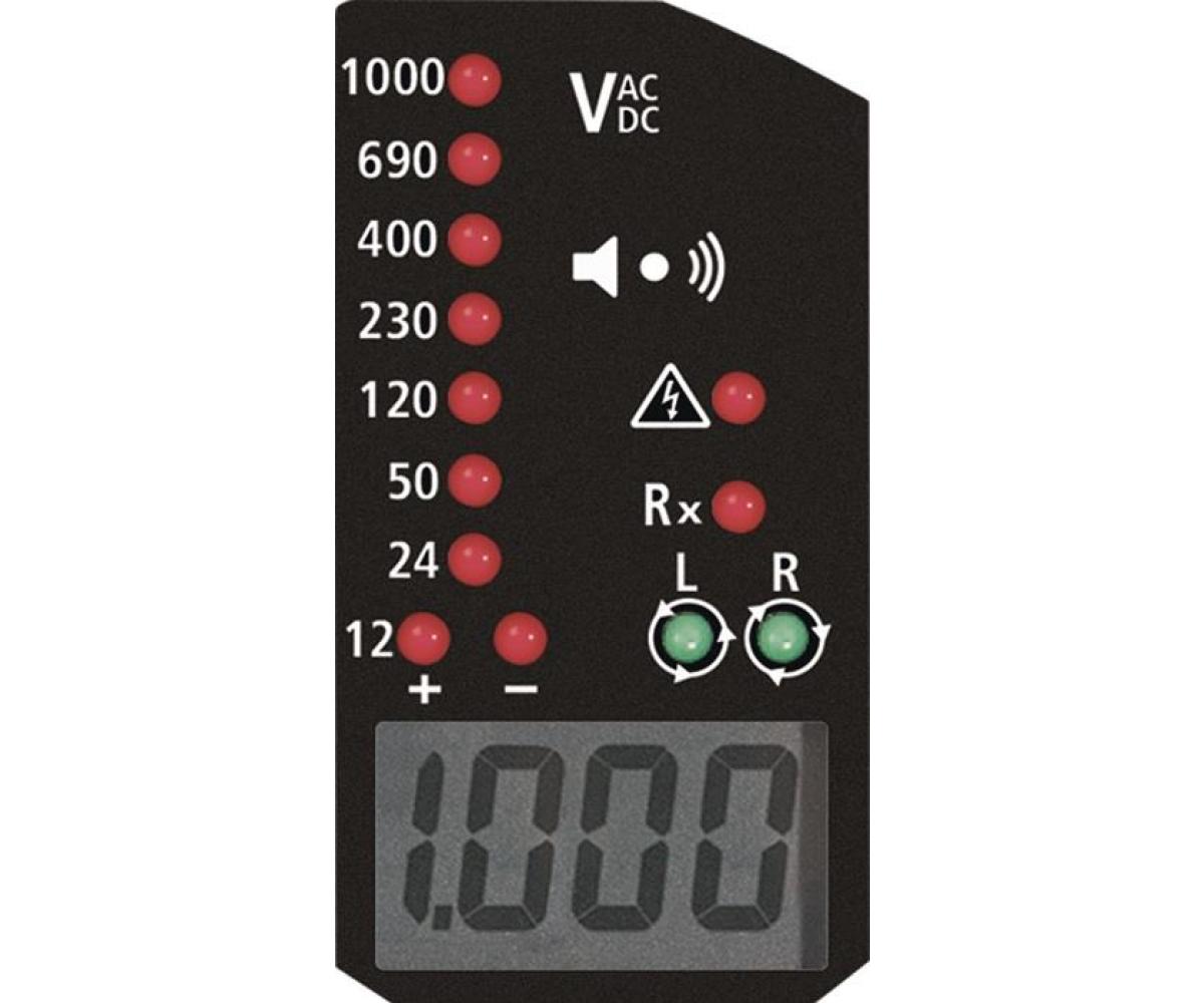 mit LED und großer Digitalanzeige sowie Messstellenbeleuchtung Technische Daten: LCD Anzeige: 4-stellig LED Anzeigestufen: 12 - 24 - 50 - 120 - 230 - 400 - 690 - 1000 V Polarität (+/-) einpolige Phasenprüfung: 100 - 1000 V AC (50/60 Hz) Drehfeldprüfung: 170 - 1000 V Phase-zu-Phase, AC 50/60 Hz Durchgangstest: 0 - 500 kO mit optischer und akustischer Anzeige Messkreiskategorie: CATIII/1000 V, CAT IV/600 V Normen: EN61243-3:2014 akustisches Signal: ja