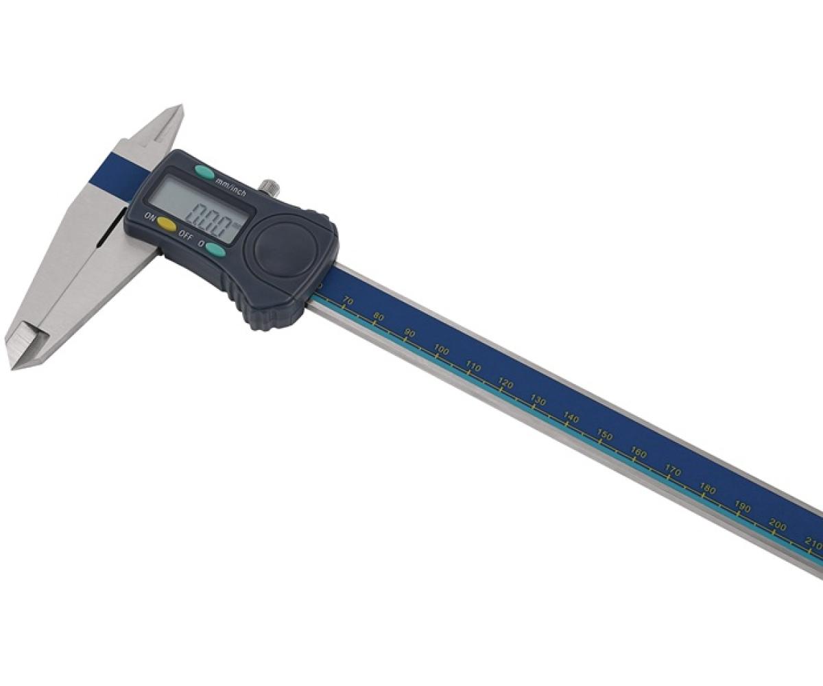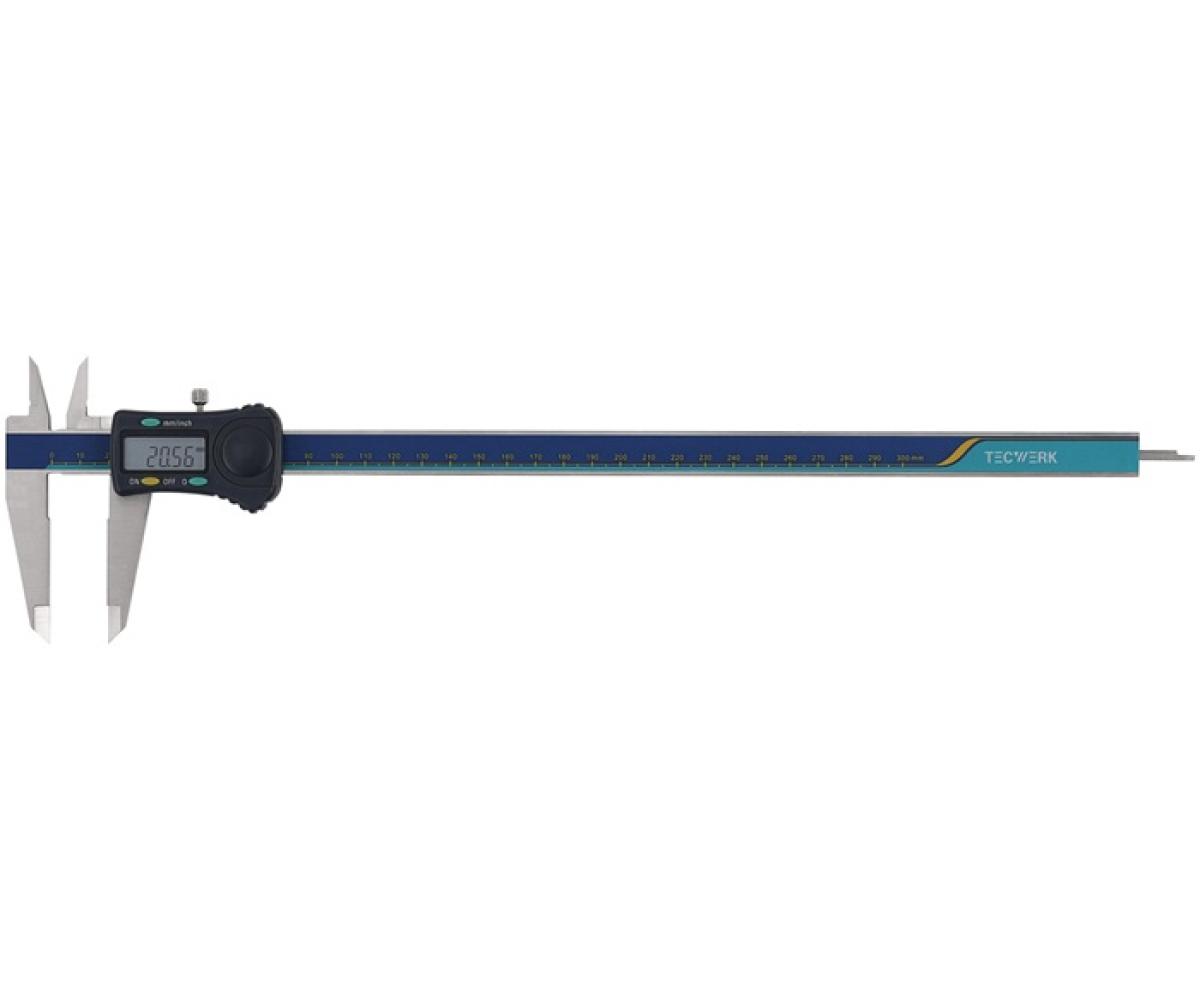 digital · gut ablesbar · Ziffernhöhe 8 mm · das kapazitive Messsystem liegt geschützt gegen Schmutz und Beschädigungen in der Messschiene · Schiene, Schnäbel und Spitzen gehärtet · Batterie-Kontrollanzeige · für Innen-, Außen- und Tiefenmessung · mit Feststellschraube · Nullpunktsetzung an jeder Stelle · Elektronik schaltet nach ca. 5 Minuten nach Nichtgebrauch eigenständig ab
