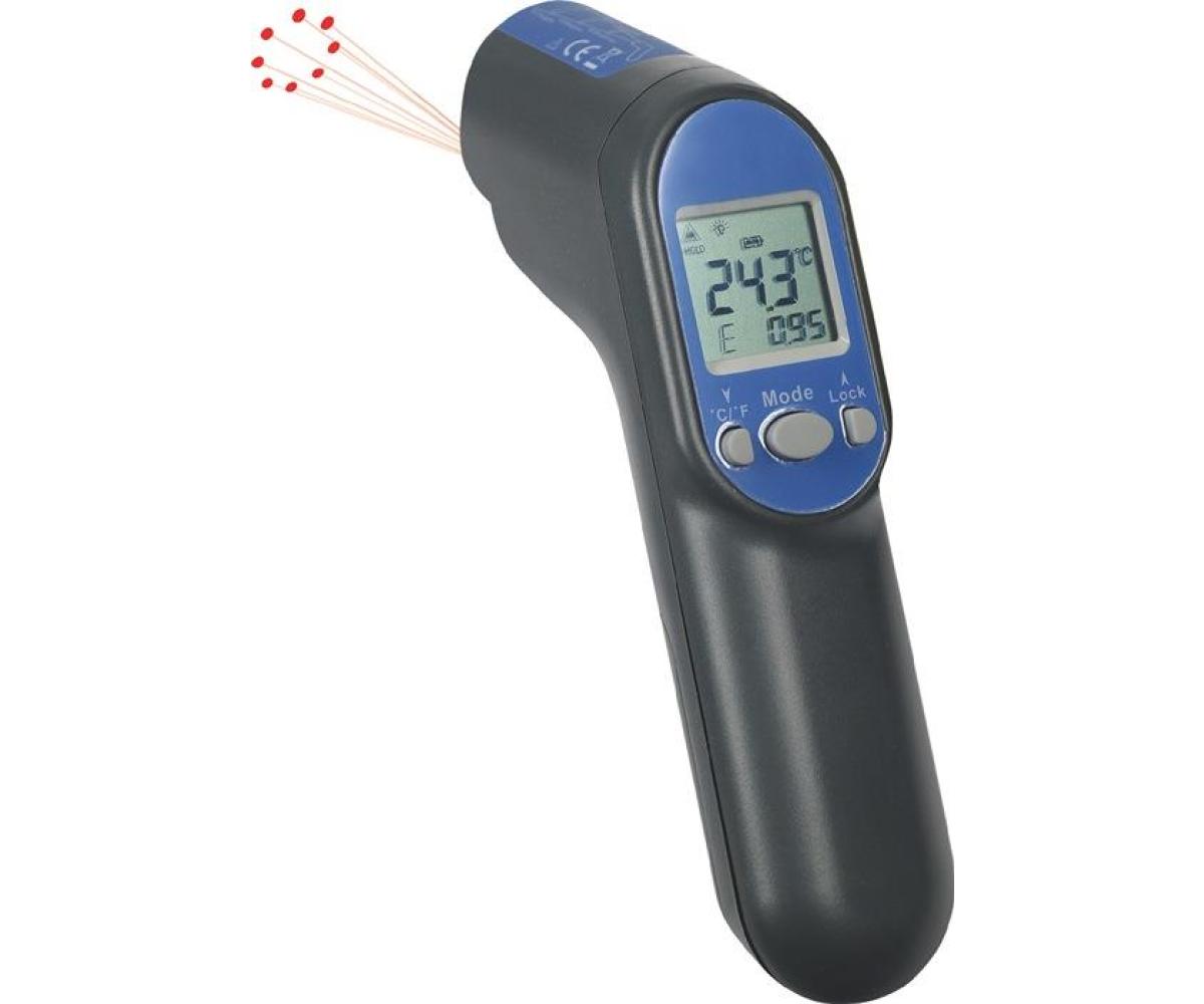 durch berührungslose Messmethode erhält man auch von heißen, gefährlichen oder schwer erreichbaren Objekten die Oberflächentemperatur · für spiegelnde Oberflächen nicht geeignet · mit dem Kreislaser kann Messfleck genau angepeilt werden · 1 Sek. Messdauer · Anzeige der aktuellen Temperatur, Höchst- und Tiefsttemperatur · HOLD/MAX/MIN/LOCK/DIF/AVG-Funktion · Alarm bei Unter-/Überschreiten von frei einstellbaren Temperaturwerten · Hintergrundbeleuchtung · umschaltbar °C/°F · einstellbarer Emissionsgrad · Thermoelementeingang
