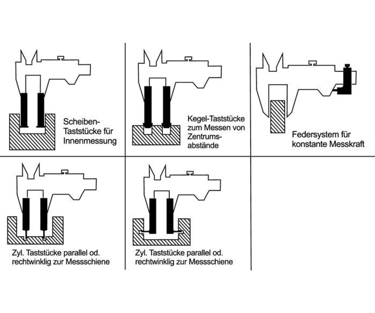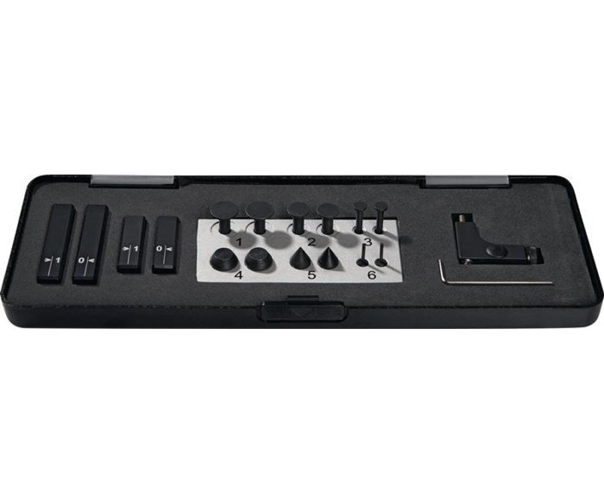 Satzinhalt: 1 Paar Taststückhalter kurz 1 Paar Taststückhalter lang je 1 Paar Tasteinsatz mit Scheibe, Ø 6/ 10/ 12,5 mm je 1 Paar Tasteinsatz mit 60° Konus, Ø 9/ 12 mm 1 Paar Tasteinsatz zylindrisch, Ø 1,5x9 mm 1 Stück Federsystem für konstante Messkraft 1 Stück Sechskantschlüssel Lieferung in KunststoffkassetteTechnische Daten