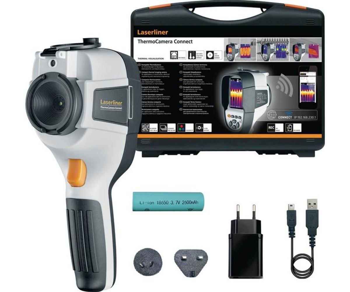 Lieferumfang: ThermoCamera Connect, Li-Ion Akkupack mit Netz-/Ladegerät und internat. Adapter, USB-Ladekabel, Tragekoffer