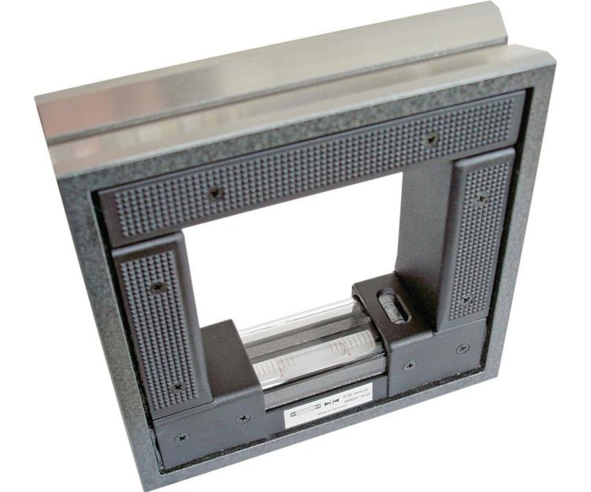 DIN 877 · Präzisionsausführung · stabile Ausführung aus hochwertigem Spezialguss, strukturlackiert · mit 3 flachen und prismatischen (150°) Seiten und 1 flachen, senkrechten Seite, zum Ausrichten von waagerechten und senkrechten Flächen und Wellen · Messflächen feingeschliffen · mit geschliffener und geteilter Längslibelle, Querlibelle und Vollwärmeschutz