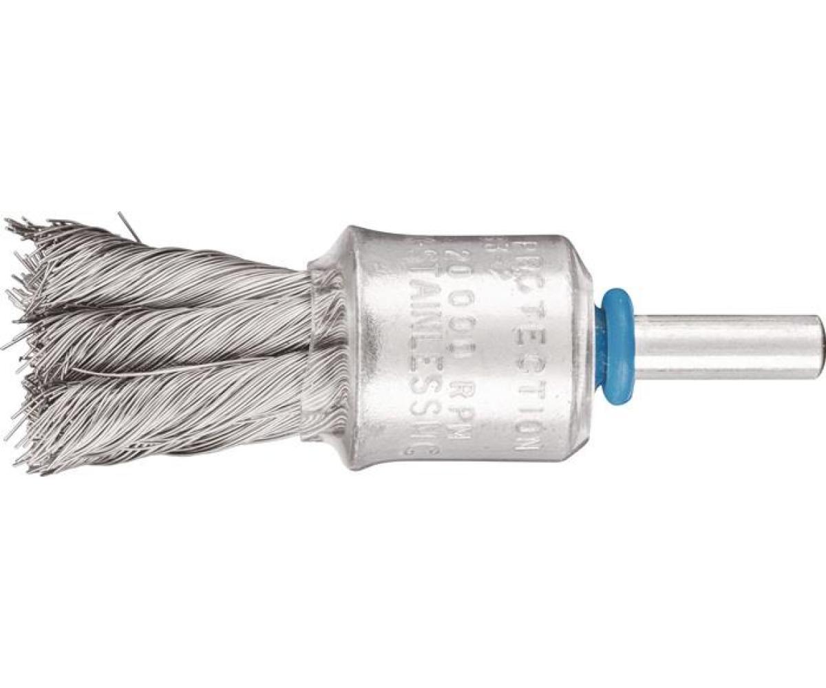 Weitere technische Eigenschaften · Antriebsart: Bohrmaschine, Geradschleifer, Biegwellenantrieb · Anwendungsempfehlung: Für beste Leistung Werkzeugantrieb mit mindestens 500 Watt verwenden. Um die Spreizung der Bürste zu kontrollieren, drehzahlregelbare Werkzeugantriebe verwenden. Bitte beachten Sie die empfohlenen Drehzahlen. · Bearbeitbare Werkstoffe: Titanlegierungen, Titan, Aluminium, Bronze, Kobaltbasislegierungen, Nickelbasislegierungen (z. B. Inconell und Hasteloy), NE-Metall hart, Hochwarmfeste Werkstoffe, weiche Titanlegierungen (Zugfestigkeit 500 N/mm²), Weitere NE-Metalle, Superlegierungen auf Nickel oder Titanbasis, Edelstahl (INOX) · Bearbeitungsaufgaben: Schweißnahtbearbeitung, Entrosten, Entzundern, Anlauffarben entfernen, Reinigen, Oxydschichten entfernen, Kehlnahtbearbeitung, Entlacken, Wurzelnahtbearbeitung, Entgraten · Besatzmaterial: Edelstahldraht (INOX) · Ø Schaft: 6mm · Ø Topf: 19mm · RPM, opt., bis: 13000RPM · RPM, opt., von: 8000RPM · Sicherheitshinweise: Beim Einspannen der Bürste ist darauf zu achten, dass der Schaft möglichst weit in die Aufnahme eingespannt wird. Dies gilt insbesondere für den Einsatz im hohen Drehzahlbereich. Die Mindesteinspannlänge beträgt 10 mm. · Verpackungen: Industrieverpackung · Vorteile: Die Bürste ist entfettet und hinterlässt keine Ölrückstände auf dem Werkstück. Optimales Erreichen von schwer zugänglichen Stellen wie Vertiefungen und Bohrungen. Durch den Kunststoffüberzug wird das Risiko der Kontaktkorrosion vermieden. Aggressiver Bürsteffekt durch hohe Steifigkeit der Drahtzöpfe. Sehr gute Korrosionsbeständigkeit. · Pinselbürste PBG INOX · D.19mm Drahtstärke 0,25mm · VA 20000min-¹ PFERD ·