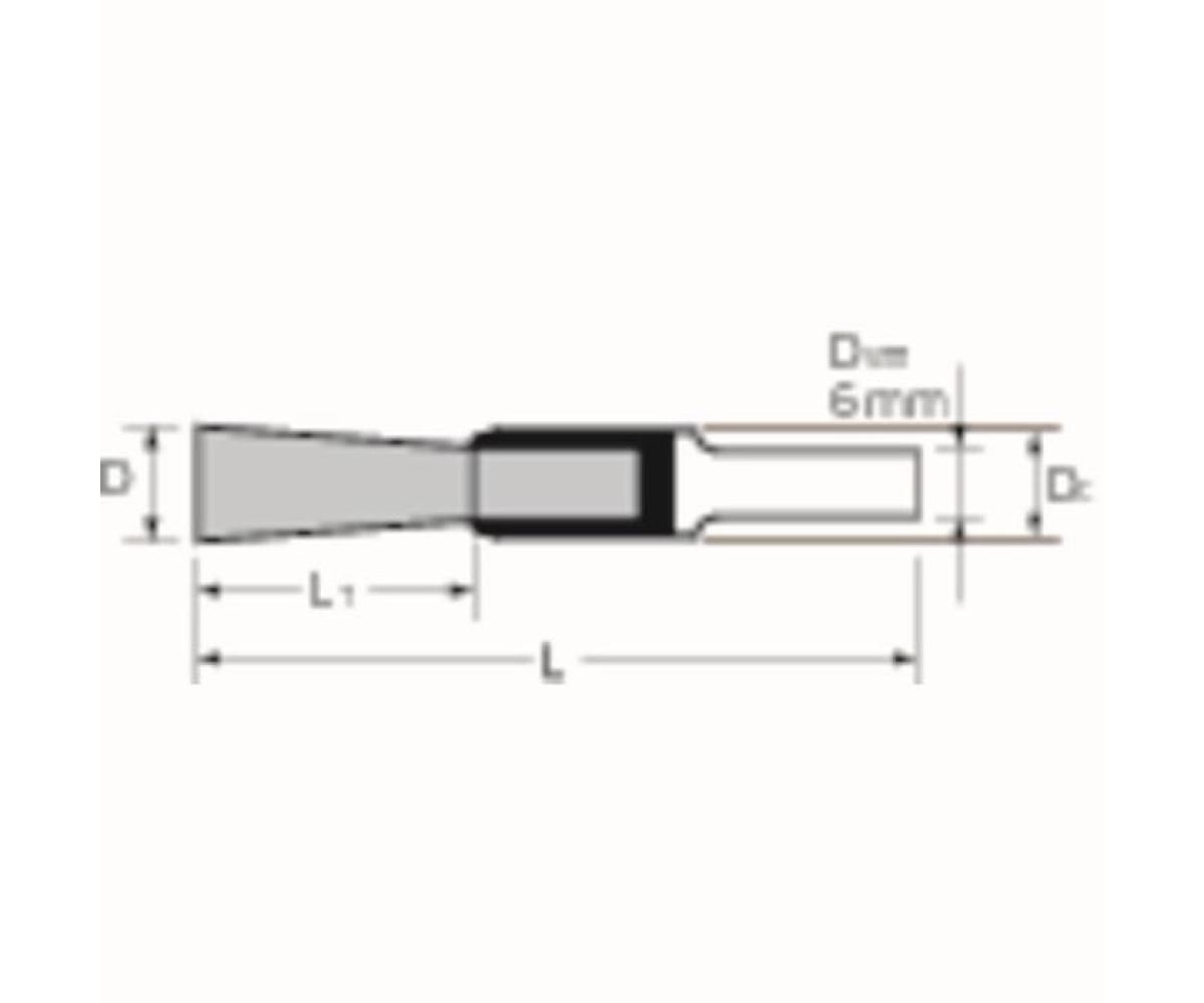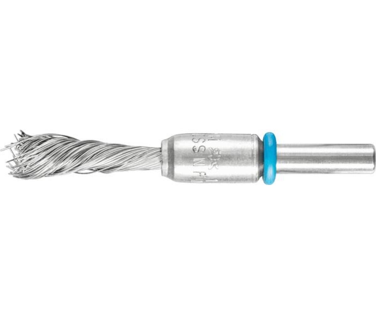 Weitere technische Eigenschaften · Antriebsart: Geradschleifer, Bohrmaschine, Biegwellenantrieb · Anwendungsempfehlung: Für optimale Ergebnisse auf drehzahlregelbaren Werkzeugantrieben einsetzen. Für beste Leistung Werkzeugantrieb mit mindestens 300 Watt verwenden. Bitte beachten Sie die empfohlenen Drehzahlen. · Bearbeitbare Werkstoffe: NE-Metall hart, Edelstahl (INOX), Titan, Titanlegierungen, Weitere NE-Metalle, weiche Titanlegierungen (Zugfestigkeit 500 N/mm²), Hochwarmfeste Werkstoffe, Superlegierungen auf Nickel oder Titanbasis, Kobaltbasislegierungen, Bronze, Aluminium, Nickelbasislegierungen (z. B. Inconell und Hasteloy) · Bearbeitungsaufgaben: Entrosten, Entgraten, Reinigen, Schweißnahtbearbeitung, Wurzelnahtbearbeitung, Entzundern, Anlauffarben entfernen, Oxydschichten entfernen, Kehlnahtbearbeitung, Entlacken · Besatzmaterial: Edelstahldraht (INOX) · Ø Schaft: 6mm · Ø Topf: 10mm · RPM, opt., bis: 6500RPM · RPM, opt., von: 4000RPM · Sicherheitshinweise: Beim Einspannen der Bürste ist darauf zu achten, dass der Schaft möglichst weit in die Aufnahme eingespannt wird. Dies gilt insbesondere für den Einsatz im hohen Drehzahlbereich. Die Mindesteinspannlänge beträgt 10 mm. · Verpackungen: Industrieverpackung · Vorteile: Durch den Kunststoffüberzug wird das Risiko der Kontaktkorrosion vermieden. Sehr gute Korrosionsbeständigkeit. Optimales Erreichen von schwer zugänglichen Stellen wie Innenecken, da sich die Zopfung nicht aufdreht. Die Bürste ist entfettet und hinterlässt keine Ölrückstände auf dem Werkstück. · Pinselbürste PBGS INOX · D.10mm Drahtstärke 0,5mm · VA 0,5mm ·