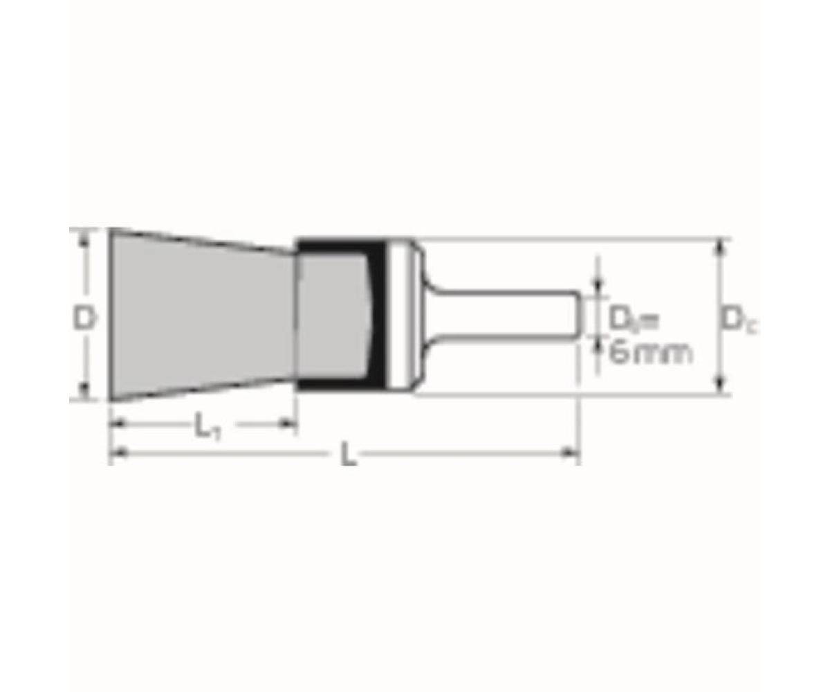 Weitere technische Eigenschaften · Antriebsart: Bohrmaschine, Geradschleifer, Biegwellenantrieb · Anwendungsempfehlung: Für besonders flexiblen Einsatz, für einen großen Aufspreizdurchmesser oder zum Erreichen schwer zugänglicher Stellen den Stützring zu Arbeitsbeginn entfernen. Stützring entfernen, sobald der Besatz bis zum Stützring abgearbeitet ist. So kann der restliche Besatz freigesetzt und vollständig verbraucht werden. Für beste Leistung Werkzeugantrieb mit mindestens 300 Watt verwenden. Bitte beachten Sie die empfohlenen Drehzahlen. · Bearbeitbare Werkstoffe: Superlegierungen auf Nickel oder Titanbasis, Titanlegierungen, Titan, Edelstahl (INOX), Weitere NE-Metalle, Nickelbasislegierungen (z. B. Inconell und Hasteloy), Hochwarmfeste Werkstoffe, NE-Metall hart, Kobaltbasislegierungen, Bronze, Aluminium, weiche Titanlegierungen (Zugfestigkeit 500 N/mm²) · Bearbeitungsaufgaben: Anlauffarben entfernen, Aufrauen, Oxydschichten entfernen, Entrosten, Entgraten, Reinigen, Entlacken · Besatzmaterial: Edelstahldraht (INOX) · Ø Schaft: 6mm · Ø Topf: 22mm · RPM, opt., bis: 11700RPM · RPM, opt., von: 7200RPM · Sicherheitshinweise: Beim Einspannen der Bürste ist darauf zu achten, dass der Schaft möglichst weit in die Aufnahme eingespannt wird. Dies gilt insbesondere für den Einsatz im hohen Drehzahlbereich. Die Mindesteinspannlänge beträgt 10 mm. · Verpackungen: Industrieverpackung · Vorteile: Die Bürste ist entfettet und hinterlässt keine Ölrückstände auf dem Werkstück. Sehr gute Korrosionsbeständigkeit. Erzeugt feine Oberflächen. Spreizung und Flexibilität des Bürstenbesatzes durch Stützring exakt regulierbar. Optimales Erreichen von schwer zugänglichen Stellen wie Vertiefungen und Bohrungen. Ist der Besatz bis zum Stützring abgearbeitet kann dieser zur weiteren Nutzung entfernt werden, ohne dass sich das Bürstverhalten ändert. Durch den Kunststoffüberzug wird das Risiko der Kontaktkorrosion vermieden. Durch den Stützring wird ein seitliches Ausweichen der Drähte vermieden. · Pinselbürste PBU INOX · D.20mm Drahtstärke 0,2mm · VA 0,2mm ·