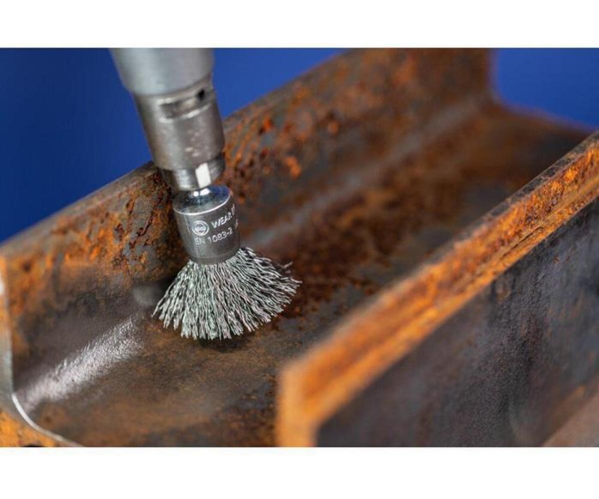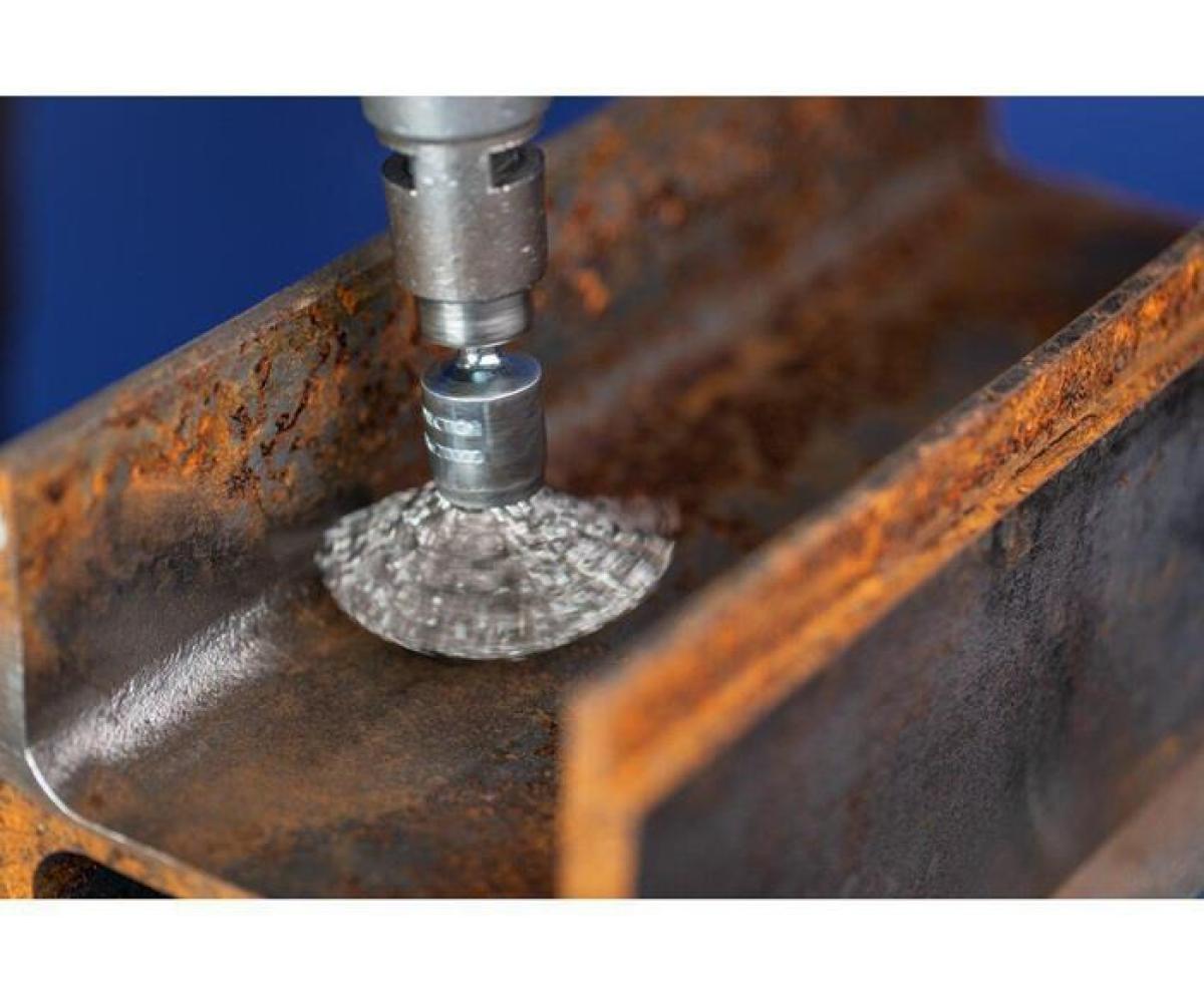 für leichte Bürstarbeiten wie Entgraten, Reinigen und Entrosten · das Besatzmaterial Stahldraht verfügt über eine hohe Zug- und Biegewechselfestigkeit · gewährleistet eine optimale Abnutzung des Drahtes sowie eine hohe Standzeit, auch bei extremen Bürstanwendungen. Stahldraht hält Temperaturen bis 300 °C stand. Schaft-Ø 6 mm