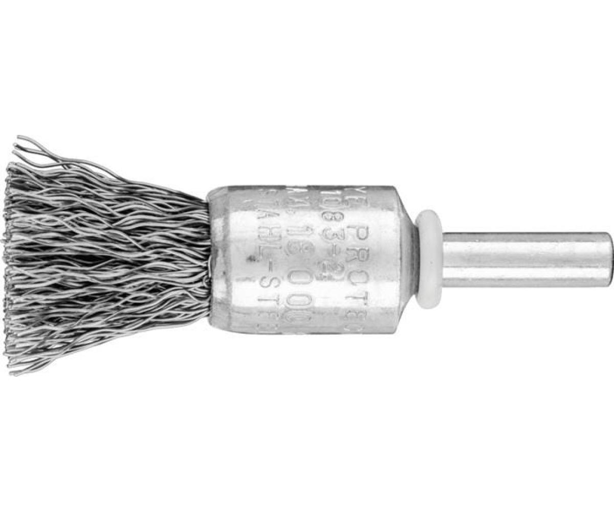 Weitere technische Eigenschaften · Antriebsart: Biegwellenantrieb, Bohrmaschine, Geradschleifer · Anwendungsempfehlung: Bitte beachten Sie die empfohlenen Drehzahlen. Für beste Leistung Werkzeugantrieb mit mindestens 300 Watt verwenden. · Bearbeitbare Werkstoffe: Stahl, Stahlguss, Holz, Elastomere, Gusseisen · Bearbeitungsaufgaben: Entgraten, Entrosten, Oxydschichten entfernen, Entlacken, Aufrauen, Reinigen · Besatzmaterial: Stahldraht (ST) · Ø Schaft: 6mm · Ø Topf: 16mm · RPM, opt., bis: 13500RPM · RPM, opt., von: 9000RPM · Sicherheitshinweise: Beim Einspannen der Bürste ist darauf zu achten, dass der Schaft möglichst weit in die Aufnahme eingespannt wird. Dies gilt insbesondere für den Einsatz im hohen Drehzahlbereich. Die Mindesteinspannlänge beträgt 10 mm. · Verpackungen: Industrieverpackung · Vorteile: Erzeugt feine Oberflächen. Optimales Erreichen von schwer zugänglichen Stellen wie Bohrungen und Hohlräume durch Aufspreizen des Besatzes bei Rotation. Lange Standzeit durch die Verwendung von PFERD-Spezialdraht. · Pinselbürste PBU ST · D.15mm Drahtstärke 0,35mm · STA 0,35mm ·
