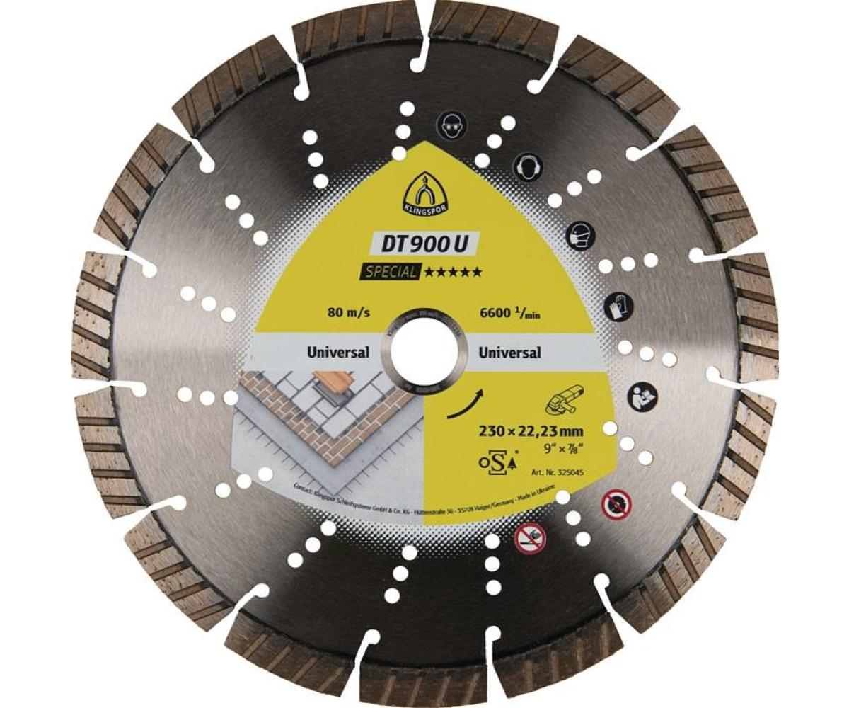 Weitere technische Eigenschaften · Anwendungsgebiet: Baustellenmaterialien, Beton, universal, Altbeton, armiert, Kalksandstein · Höchstgeschwindigkeit: 80m/s · Nutzungsart: Winkelschleifer · Randausführung: Standard Turbo · Segmentanzahl: 15 · Verpackungsart: Karton · Diamanttrennscheibe DT · 900 U Special D.230mm · Bohr.22,23mm ·