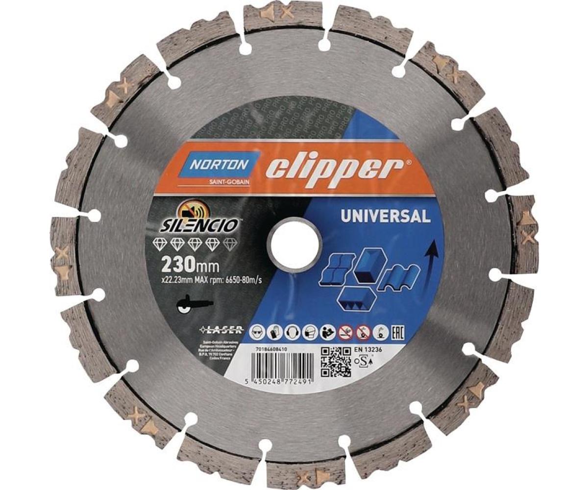 reduziert die wahrgenommenen Lärmemissionen dank eines speziellen Stahlkerns um bis zu acht Mal (-9 dB(A)) im Vergleich zu herkömmlichen Scheiben · mit 12 mm hohen Segmenten für eine längere Produktlebensdauer · ideal für Beton und alle allgemeinen Baumaterialien, erreicht einen schnellen, effizienten Schnitt mit reduziertem Lärmpegel für geräuschempfindliche Arbeitsumgebungen