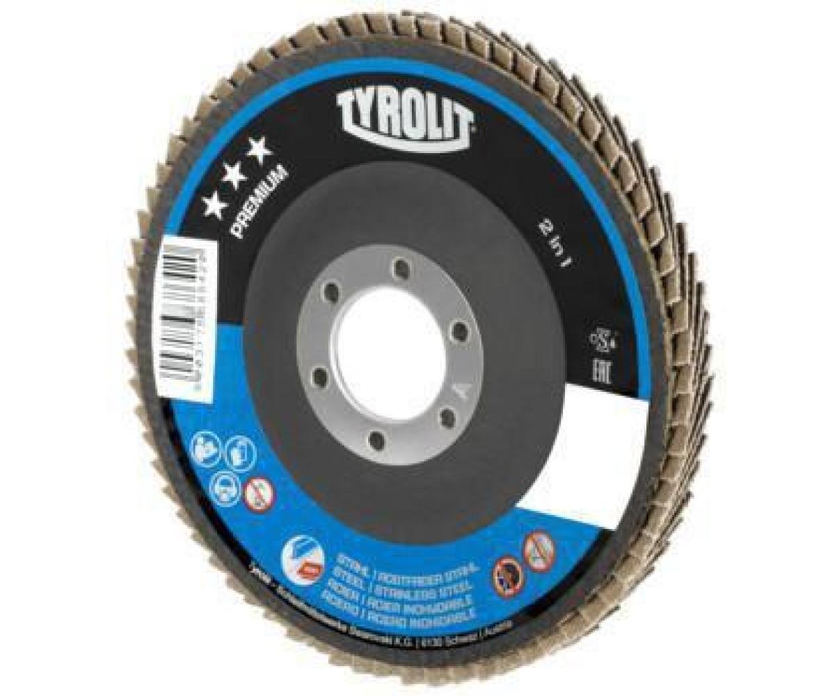 PREMIUM 2in1 Fächerscheibe kombiniert eine sehr gute Lebensdauer mit einem sehr hohen spezifischen Abtrag · für anspruchsvolle Schleifanwendungen auf verschiedenen Stahl- und Edelstahlqualitäten · für die Schweißnahtbearbeitung sowie den Kanten- und Flächenschliff · höchste Abtragsleistung · Bohrung 22,23 mm Ø