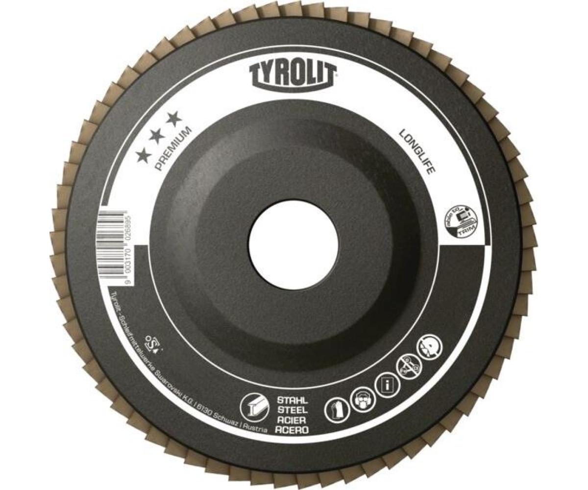 Weitere technische Eigenschaften · Bohrung: 22,23mm · D x H: 125 x 22,23mm · Nettogewicht: 0,095kg · Produktlinie: PREMIUM · Spezifikation: ZA 60 S- B · Vs /max: 50m/s · Fächerscheibe PREMIUM · LONGLIFE D.125mm K.60 · ger.STA ZA-ZK TYROLIT ·